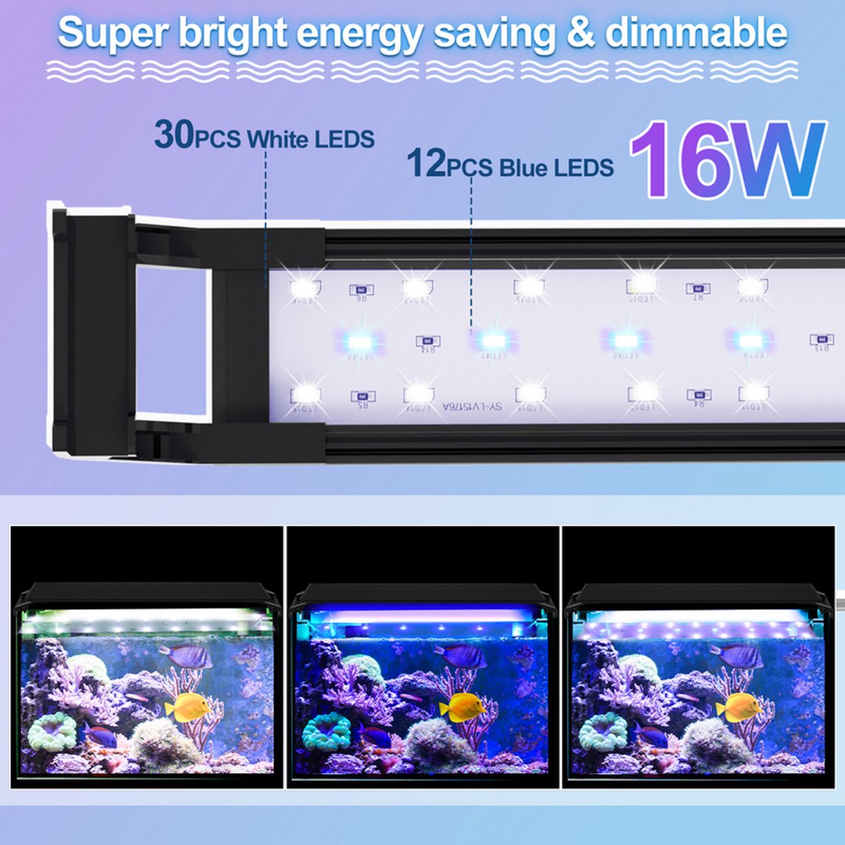 Deze 16W LED aquariumverlichting is ontworpen voor gebruik boven aquaria en kleine vijveropstellingen binnenshuis. Met een ultradun profiel, telescopische dragers en een bediende controller die dimstanden en een timer biedt, richt het zich op wie een nette, zuinige en eenvoudig te bedienen lichtoplossing wil zonder ingewikkelde app-koppelingen of prijzige armaturen.