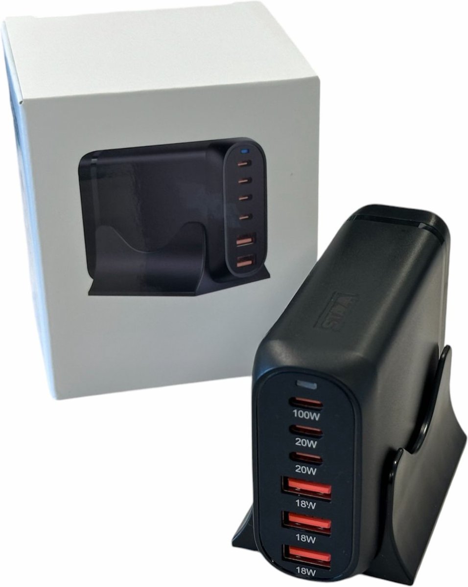 Met drie USB-C- en drie USB-A-poorten kun je simultaan meerdere apparaten bedienen, van oudere telefoons met USB-A-kabels tot moderne laptops en tablets via USB-C. Dit maakt de lader geschikt als centrale laadhub.