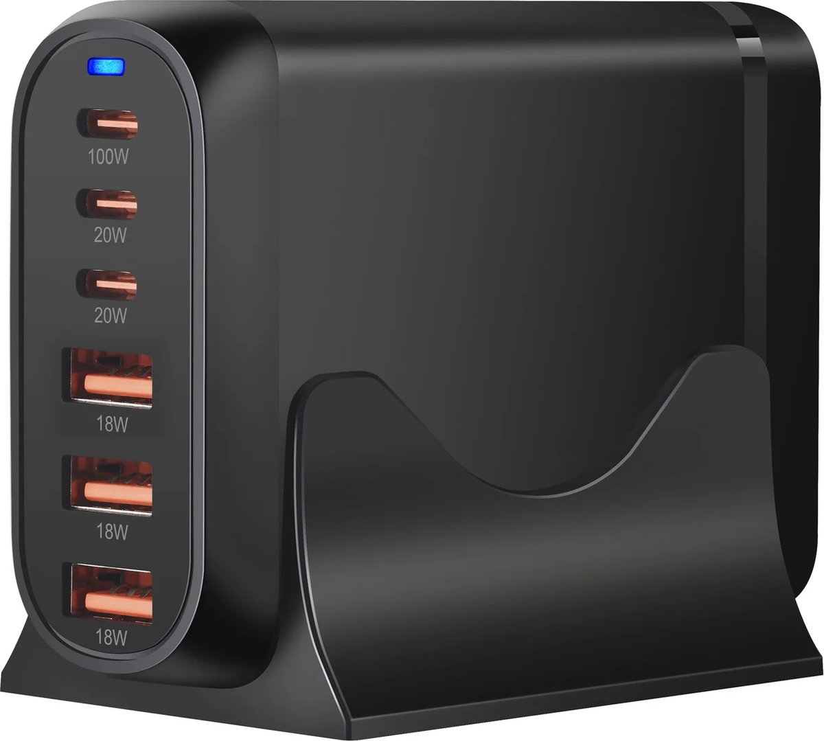 De 200W USB C Snellader is een krachtige desktop-oplader die is ontworpen om meerdere apparaten tegelijk snel en veilig van stroom te voorzien. Met drie USB-C- en drie USB-A-poorten combineert hij hoge laadcapaciteit met veelzijdigheid voor laptops, tablets en smartphones.