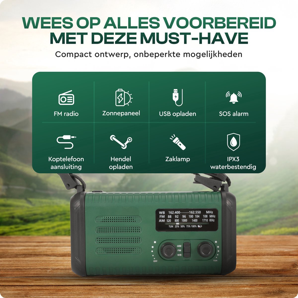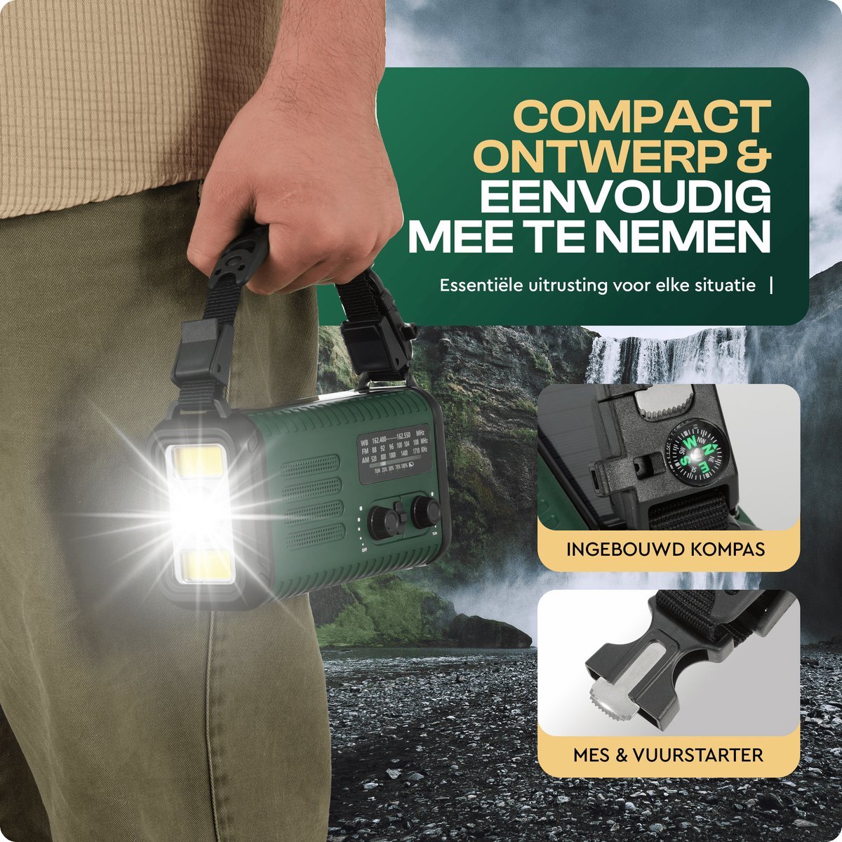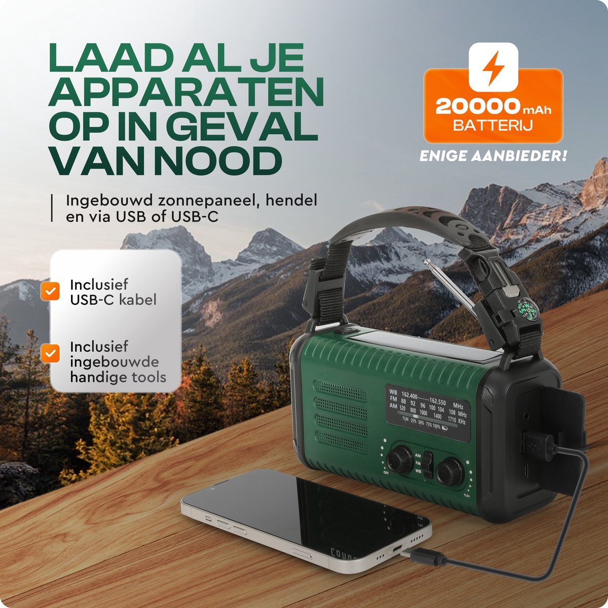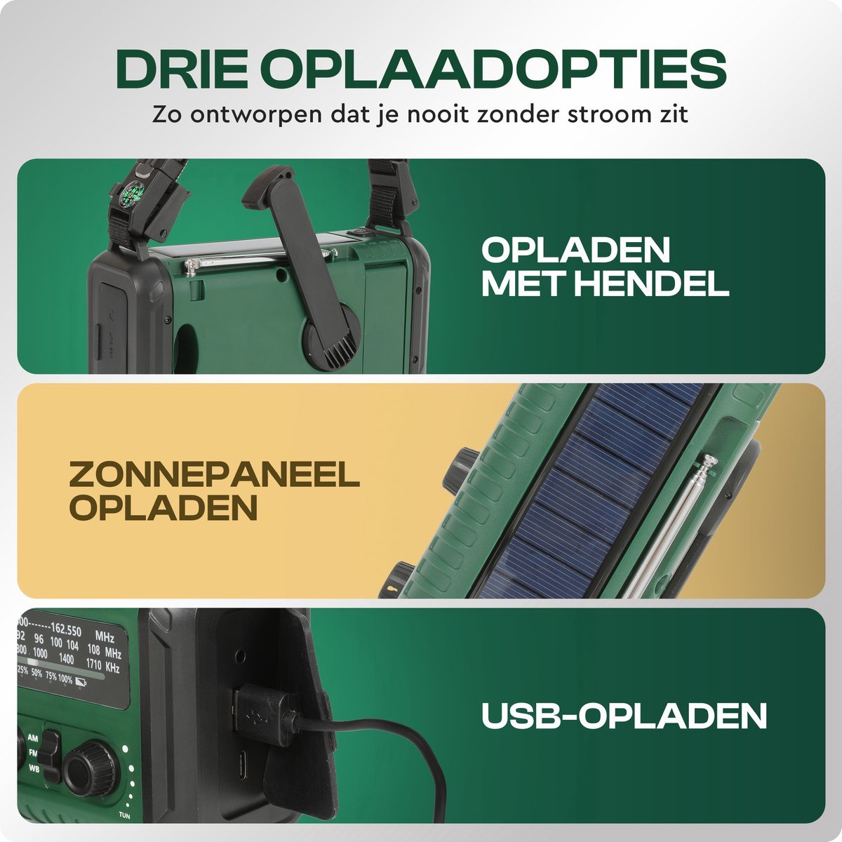 | Drie oplaadmethoden: zonnepaneel, opwindhendel en USB/USB‑C voor maximale flexibiliteit | Gewicht en materiaal niet vermeld; lastig inschatten hoe robuust en draagbaar hij exact is |