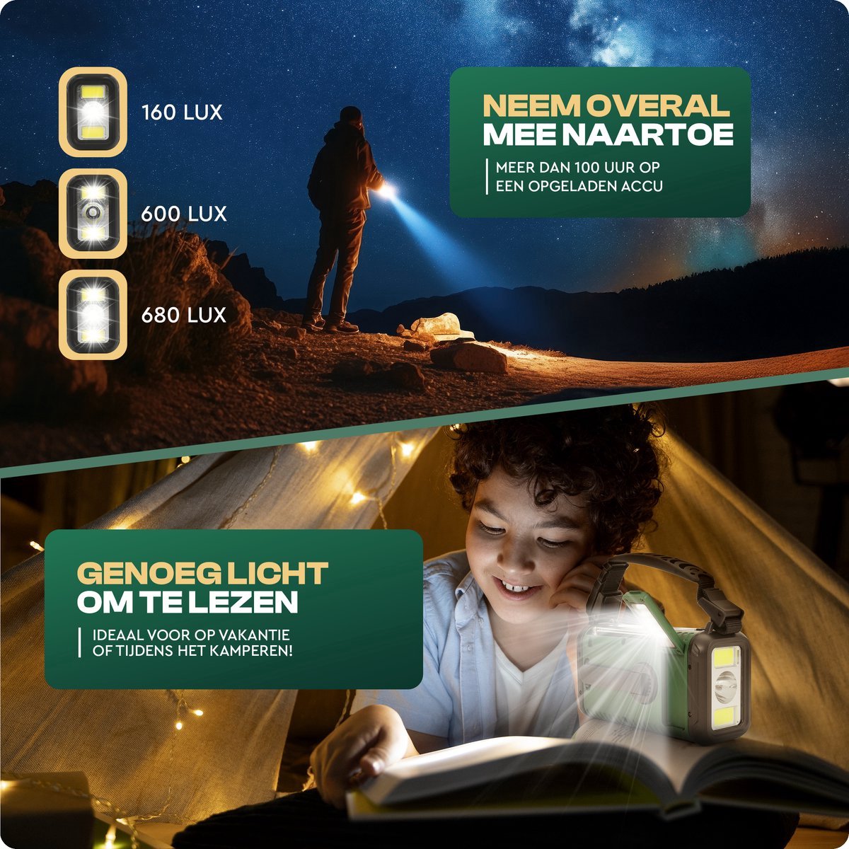 - Verlicht veilig je pad, met zaklamp en leeslamp, meer dan 100 uur.