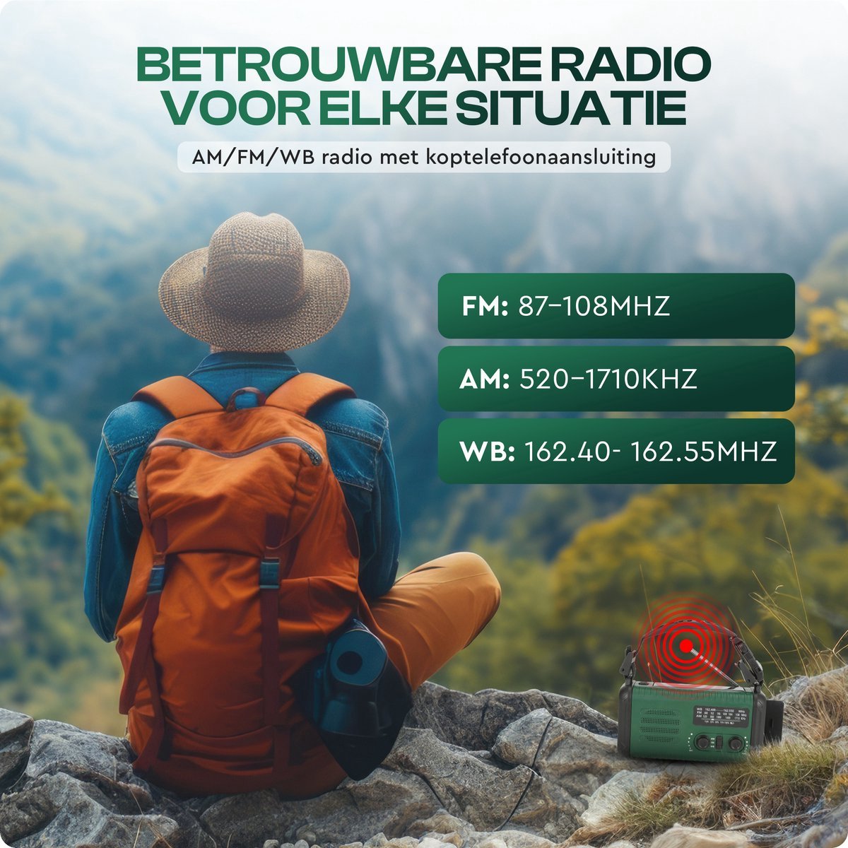 Deze unit ondersteunt AM, FM en WB. Daarmee kun je nieuws, regionale zenders en weerinformatie volgen. Let op: dekking en bruikbaarheid van WB kunnen per regio verschillen en zijn niet nader gespecificeerd. De koptelefoonaansluiting is welkom als je in een volle schuilplaats of thuis met slapende kinderen stil wilt luisteren.