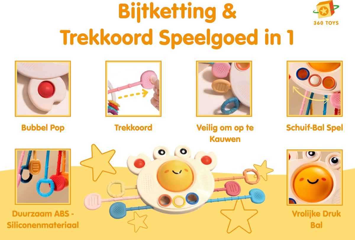 - 0–12 maanden: focus op voelen, grijpen en kauwen. De bijtketting en het trekkoord-speeltje passen goed bij deze fase.