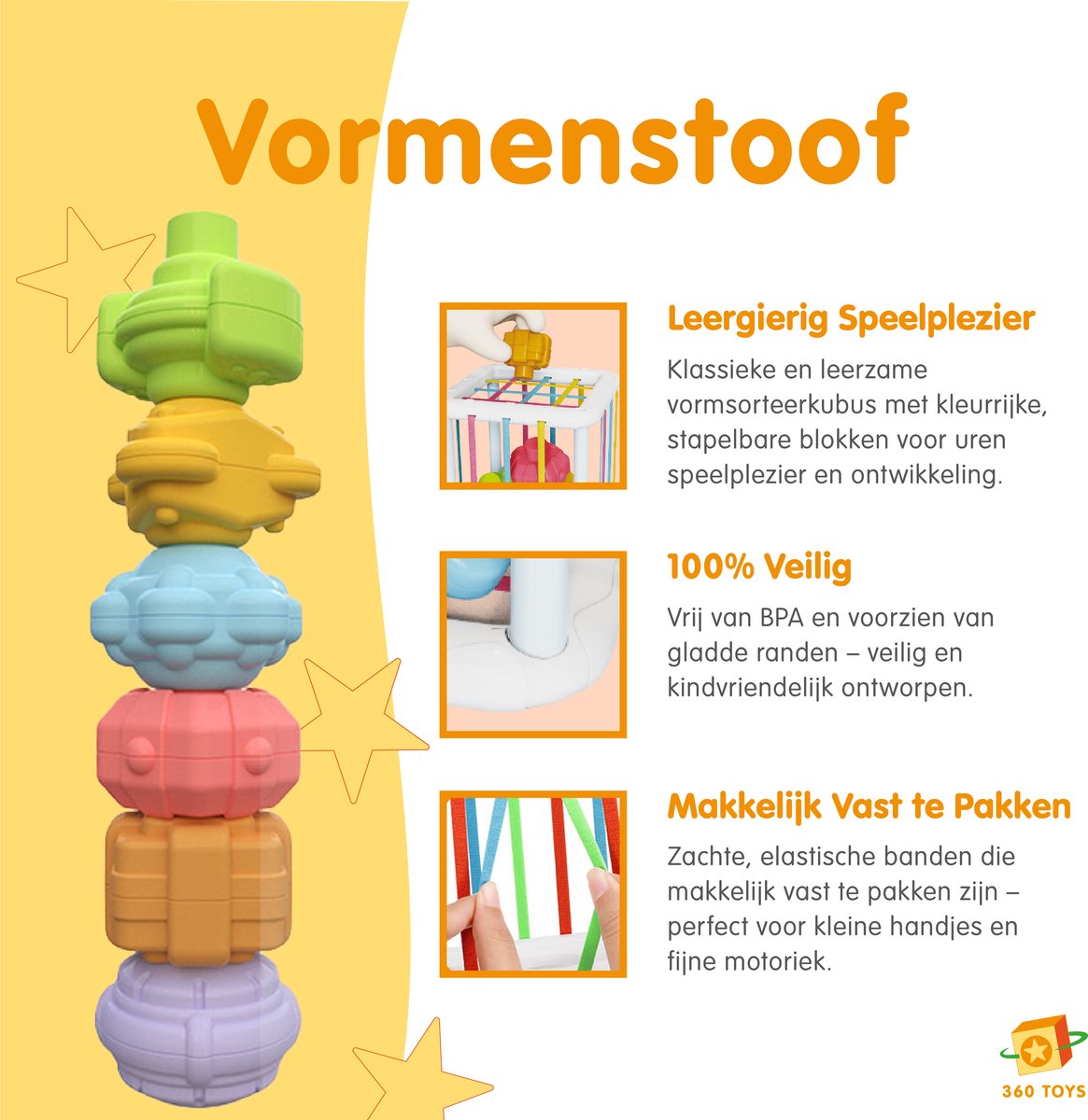 - 12–24 maanden: bouw, sorteer, benoem. De stapelstenen en de vormenstoof helpen bij motoriek en cognitieve groei.