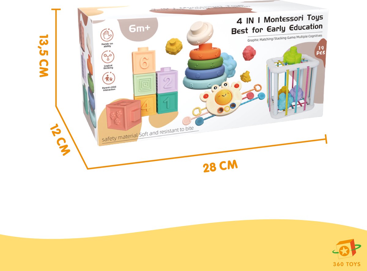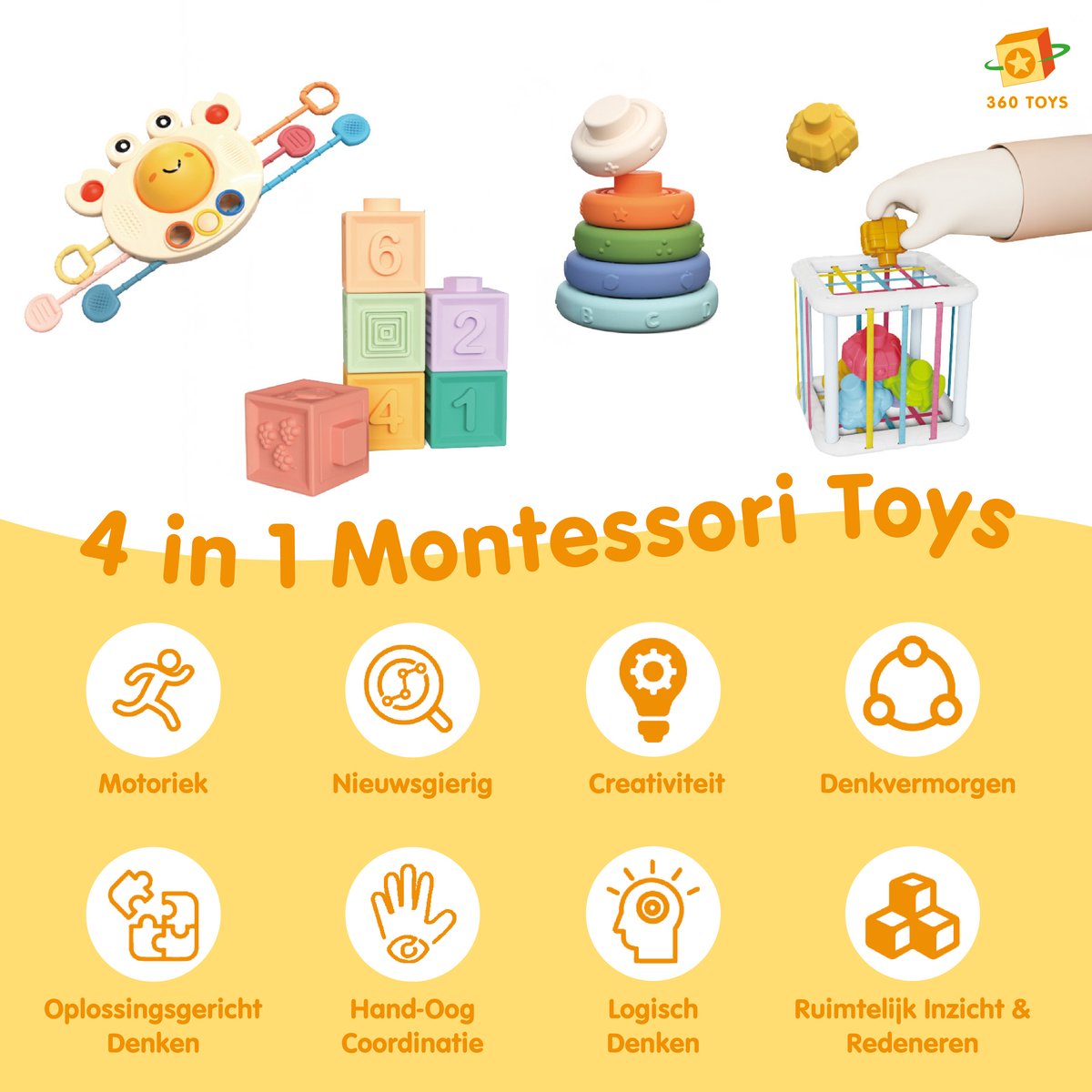 De 360 Toys 4-in-1 babyspeelgoedset is een veelzijdige, Montessori-geïnspireerde bundel met een trekkoord-speeltje, zachte stapelstenen, een comfortabele bijtketting en een klassieke vormenstoof. Het pakket is ontworpen om motoriek, zintuiglijke prikkels en logisch denken te stimuleren, en groeit mee met je kind van pasgeborene tot kleuter.