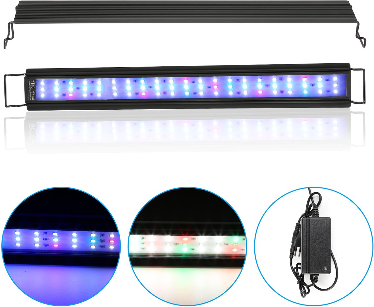 Deze aquarium led-lamp is een slanke, uittrekbare lichtbalk met drie lichtmodi, instelbare helderheid en een ingebouwde timer. Hij past op aquaria van 87 tot 110 cm en wordt geleverd met beugels en externe controller. Dankzij SMD-leds en een behuizing van metaal (door de aanbieder vermeld als aluminium) combineert hij energiezuinig licht met een stevige bouw, zonder ingewikkelde installatie.