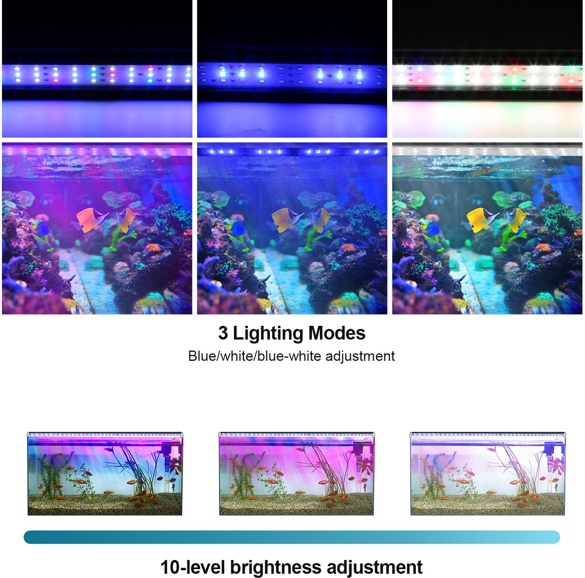 - Visuele helderheid: de stand “alle lichten aan” geeft een fris, helder beeld van het aquarium.