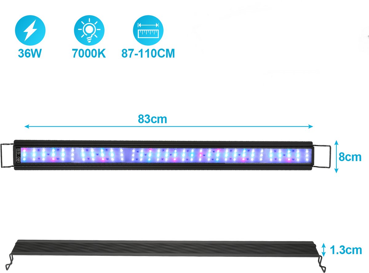 - Pas perfect op 87–110 cm aquaria; uitschuifbare beugels voor stabiele plaatsing.
