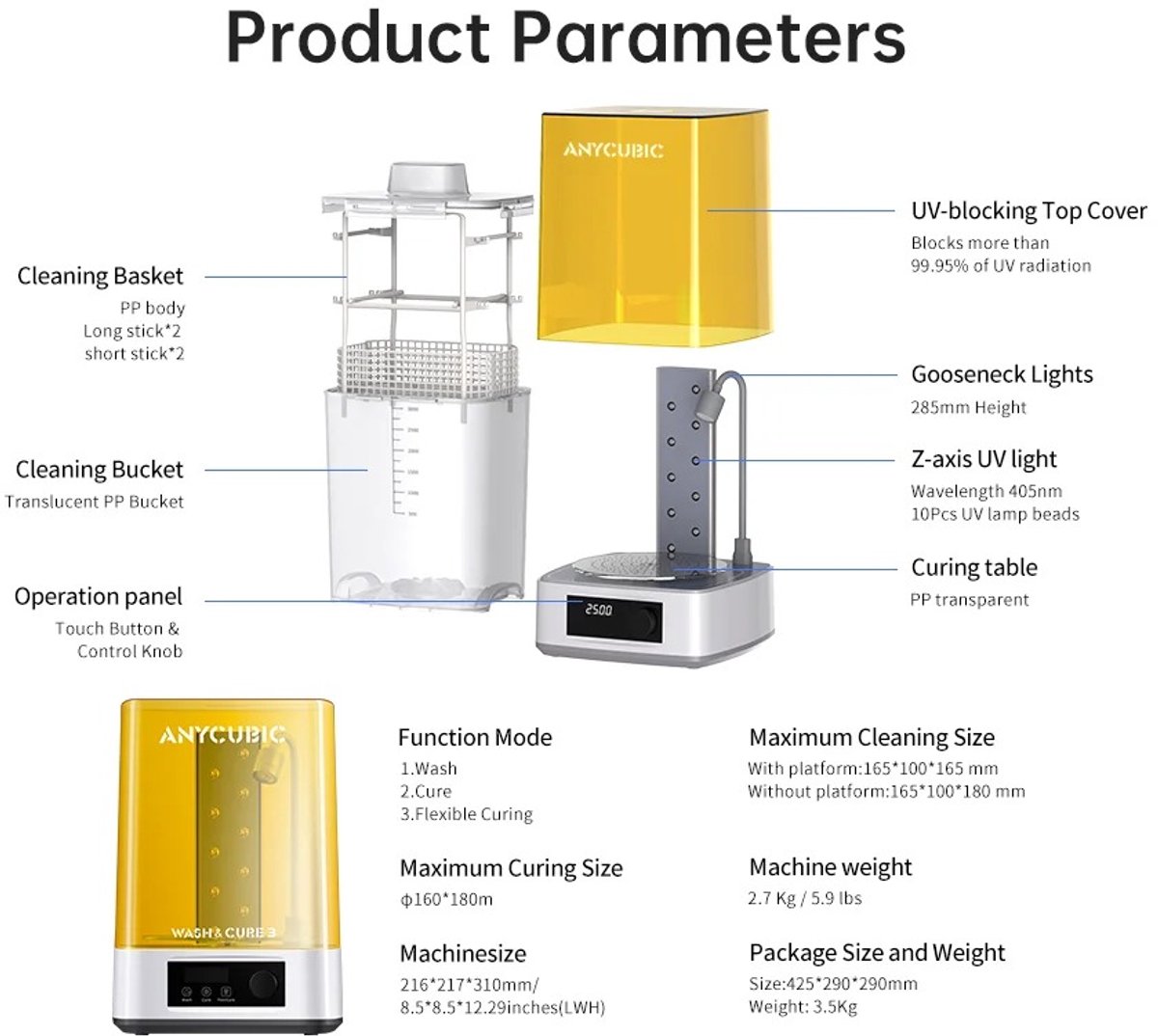 De machine is ontworpen als een nette, gesloten unit met een losse UV‑uithardingsmodule en een verwijderbare reinigingsbak. Dankzij het compacte vloeroppervlak past hij op een werkbank of plank, terwijl de hoogte ruimte biedt voor het uitharden van modellen tot een cilinder van circa Ø 160 × 180 mm (bron: listing, gecontroleerd 2025). Dat is handig voor figuren, behuizingen en technische onderdelen die meer hoogte dan breedte nodig hebben.