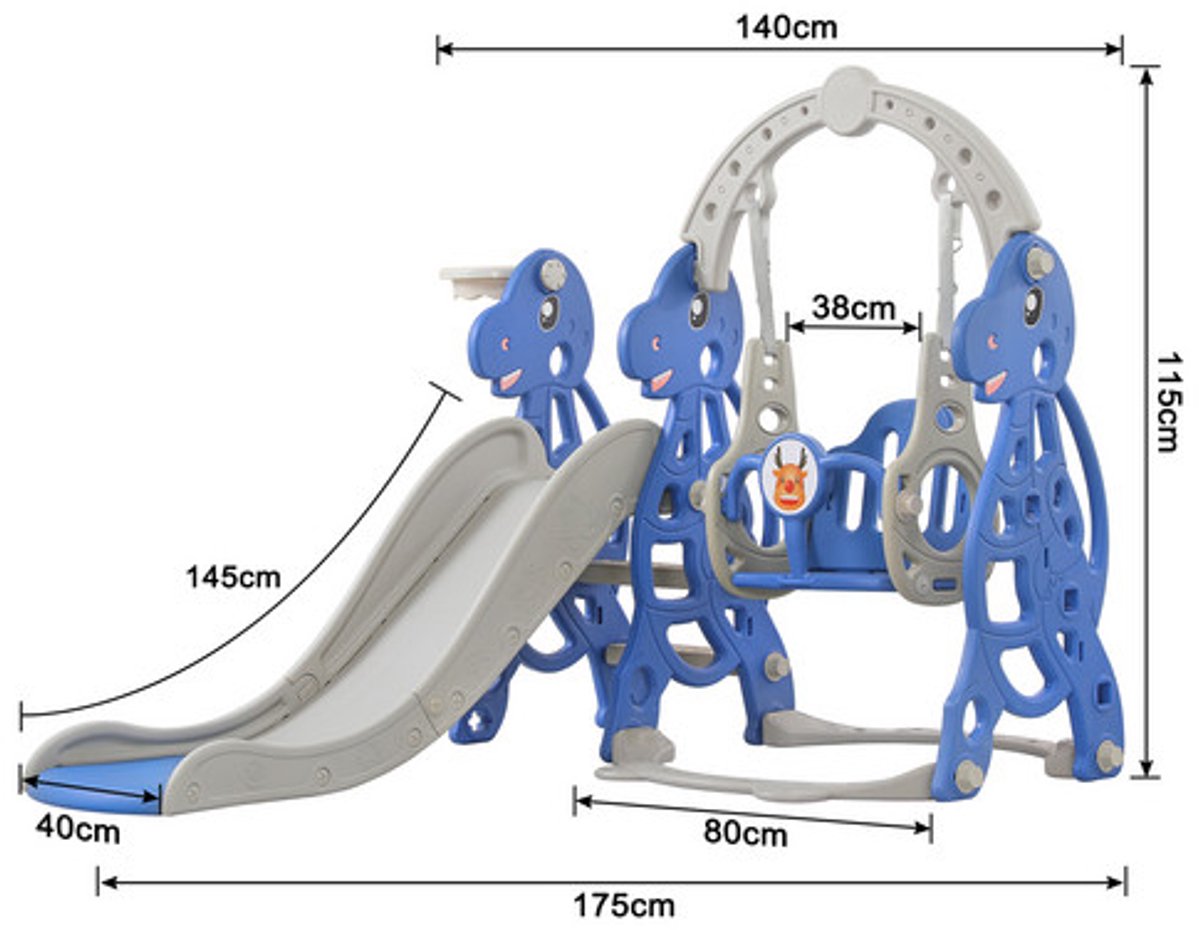 Dit toestel combineert drie speelfuncties: glijden, schommelen en basketbal spelen dankzij de meegeleverde basketbalring. De set stimuleert verschillende vormen van beweging: glijden voor balans en coördinatie, klimmen voor spieropbouw en hand-oogcoördinatie bij het mikken naar de ring.