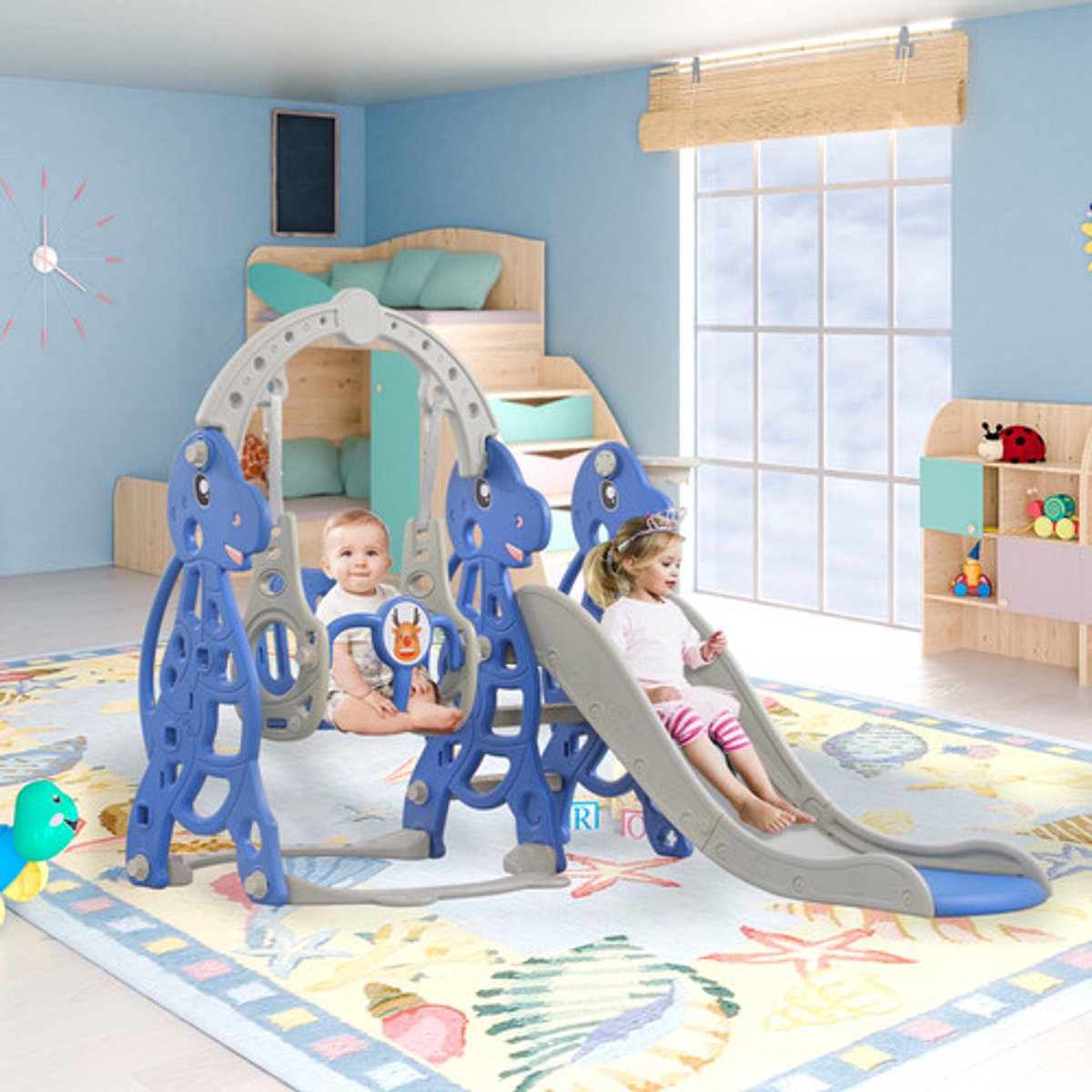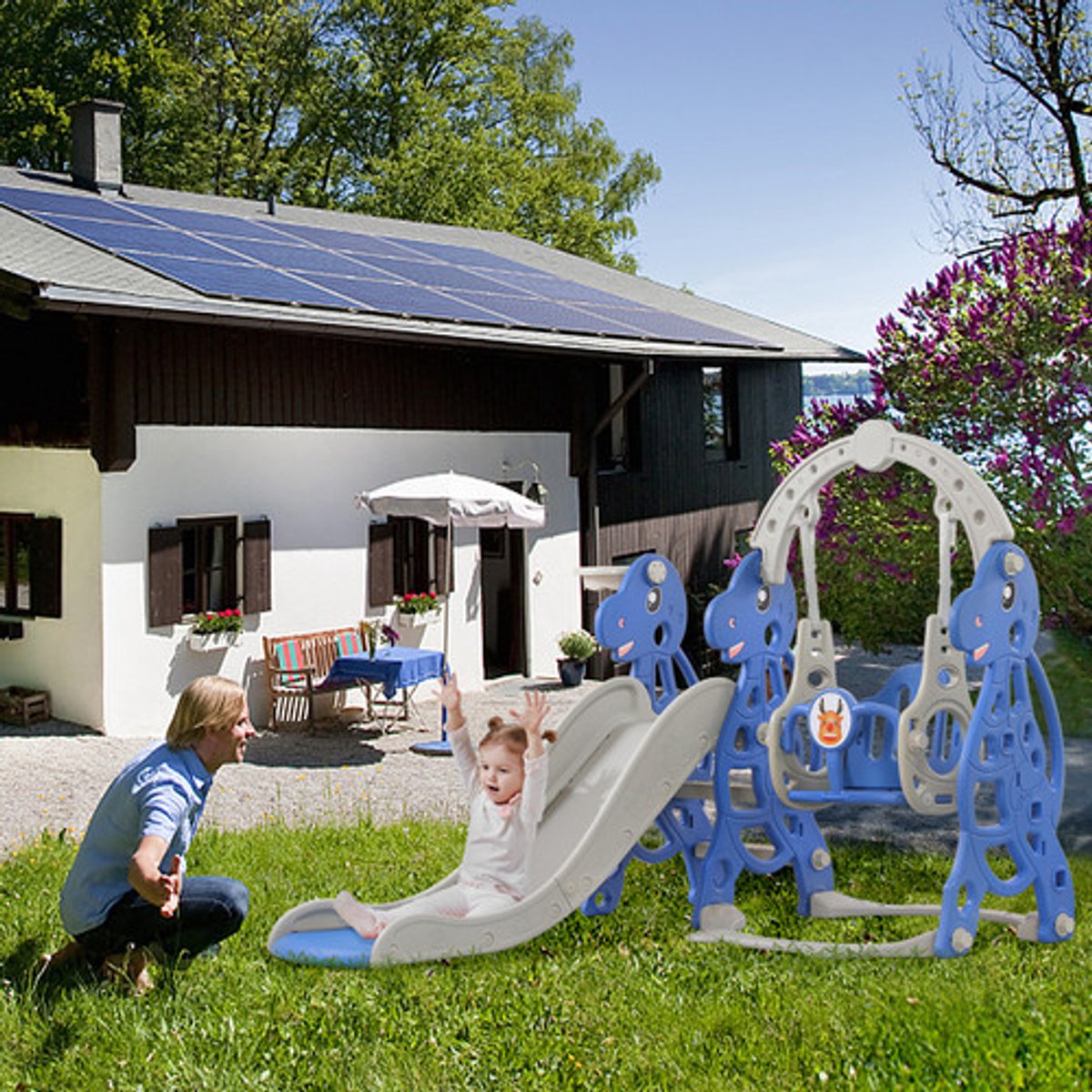 Deze 4-in-1 kinderglijbaan is een multifunctioneel speeltoestel voor kinderen van ongeveer 1 tot 5 jaar. Het combineert een glijbaan, schommel en basketbalring in één vrijstaand plastic ontwerp dat bedoeld is voor binnen- en buitengebruik. De constructie is van PP/PE-kunststof, licht van gewicht en bedoeld om motorische ontwikkeling en coördinatie te stimuleren.