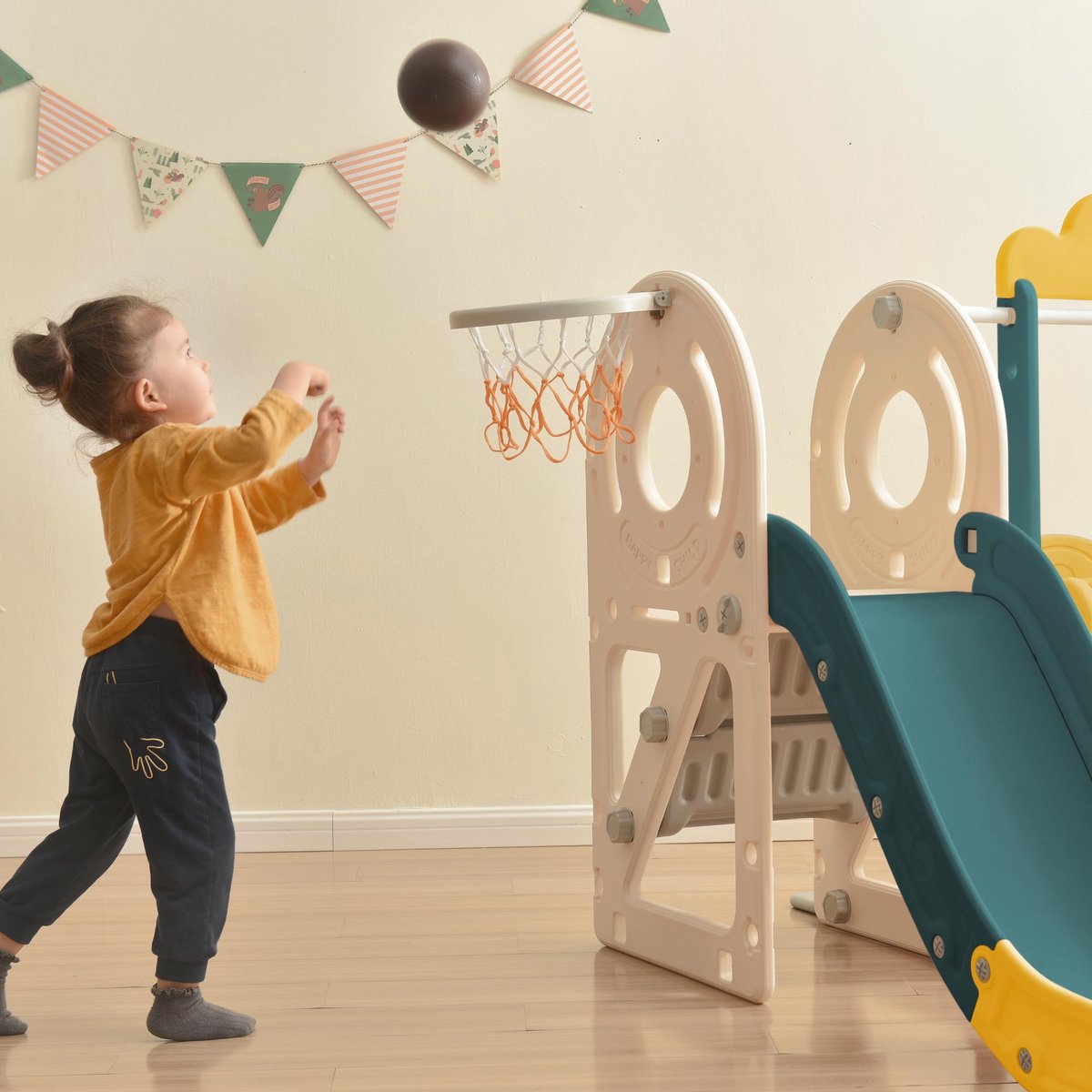De set bevat een basketbalring en een bal, waardoor een element van doelgericht sportspel wordt toegevoegd. Dit bevordert hand‑oogcoördinatie en teamspel. De basketbalring is geschikt voor startende werp‑oefeningen; gebruik het als losse activiteit of combineer het met de glijbaan voor creatieve spelregels.