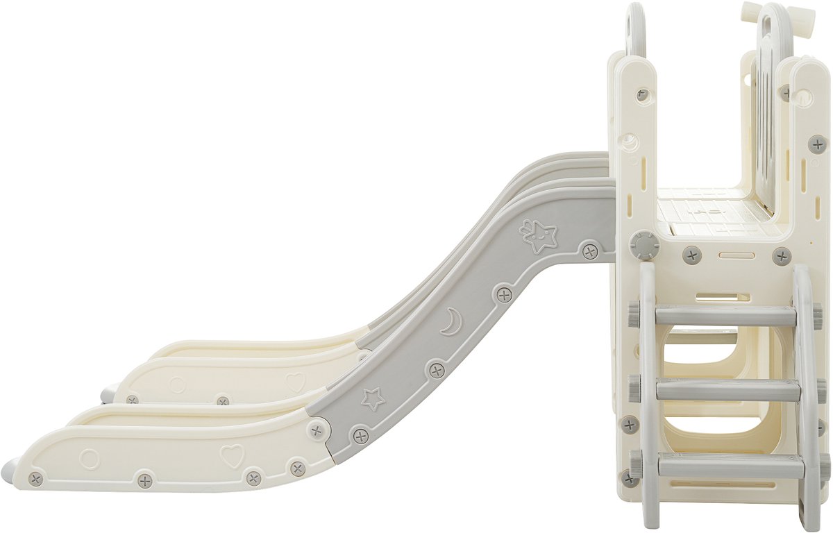 Het frame is vervaardigd uit PP (polypropyleen), een veelgebruikt kunststof dat licht van gewicht en relatief slijtvast is. De kleurstelling in de listing is grijs en wit; de fabrikant waarschuwt dat de daadwerkelijke tint licht kan afwijken door beeldscherm- en lichtomstandigheden. De glijbaan is een recht type en de capaciteit voor de glijbaan staat op maximaal 40 kg (bron: listing, gecontroleerd 2025). Montage vereist volledige assemblage en wordt aangeraden met twee personen (bron: listing, gecontroleerd 2025).