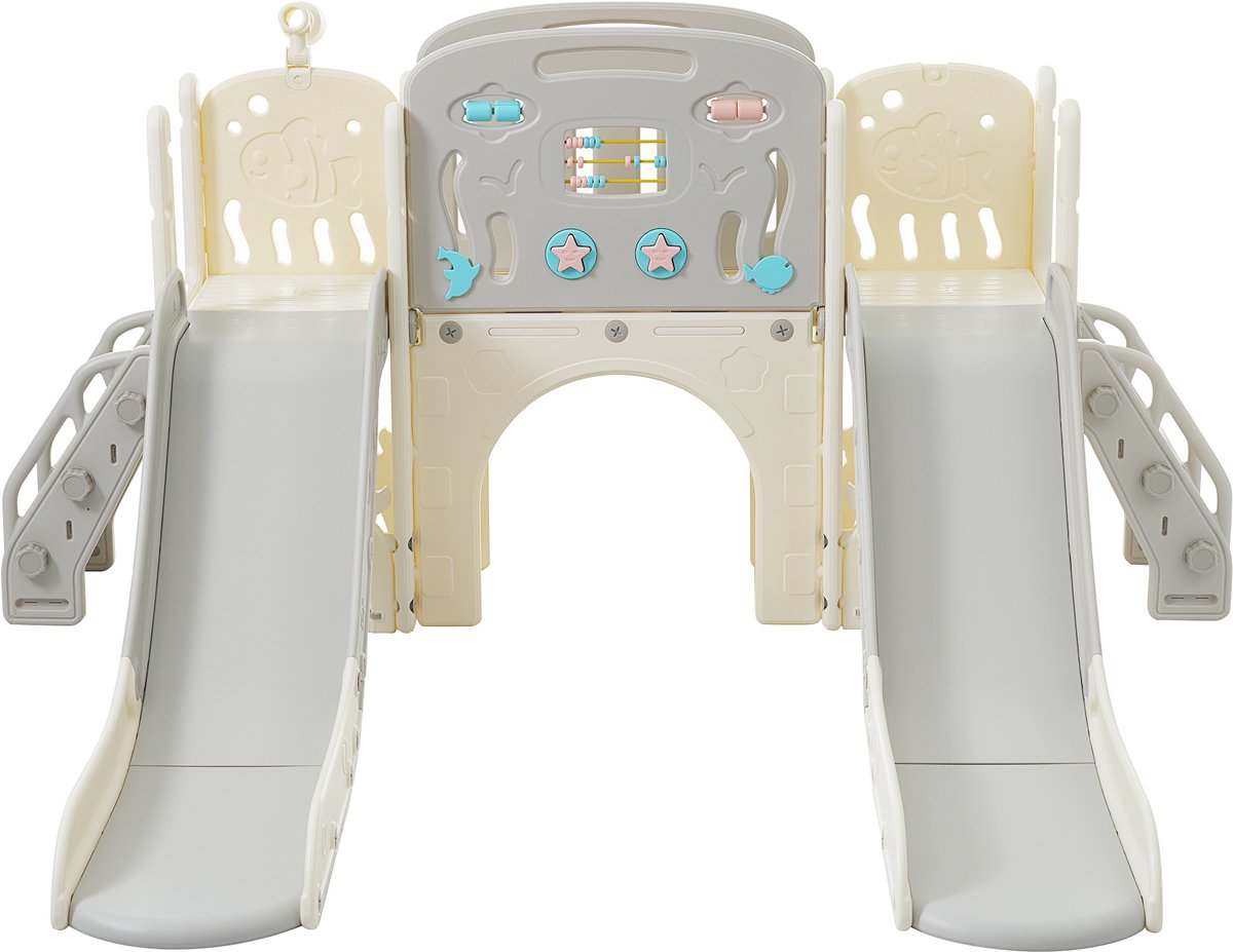 Deze aanduiding suggereert een combinatie van twee speelfuncties in één apparaat — glijden plus een extra spelelement (bijvoorbeeld klimgedeelte of tunnel). Dat betekent meer speelvariatie zonder extra vloeroppervlak te gebruiken. In de praktijk werkt dit goed voor gezinnen met één of twee jonge kinderen die binnen afwisselend willen klimmen en glijden.