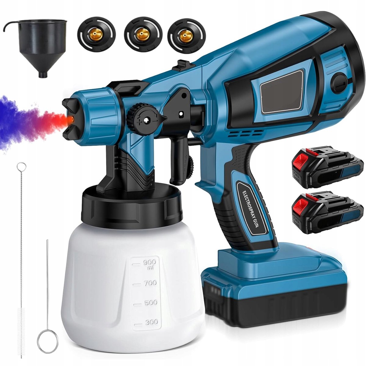 De 900 ml tank is groot genoeg om een wand of meerdere panelen te doen zonder telkens na te vullen. Je kunt volgens de productvermelding met Makita 18V/21V accu’s werken, waardoor je niet vastzit aan een stopcontact. In de set zitten bovendien twee accu’s, een trechter, reinigingsnaald, borstel en drie spuitmondstukken (1,0/1,8/2,5 mm) plus een Europese oplader. Je kunt dus direct aan de slag.