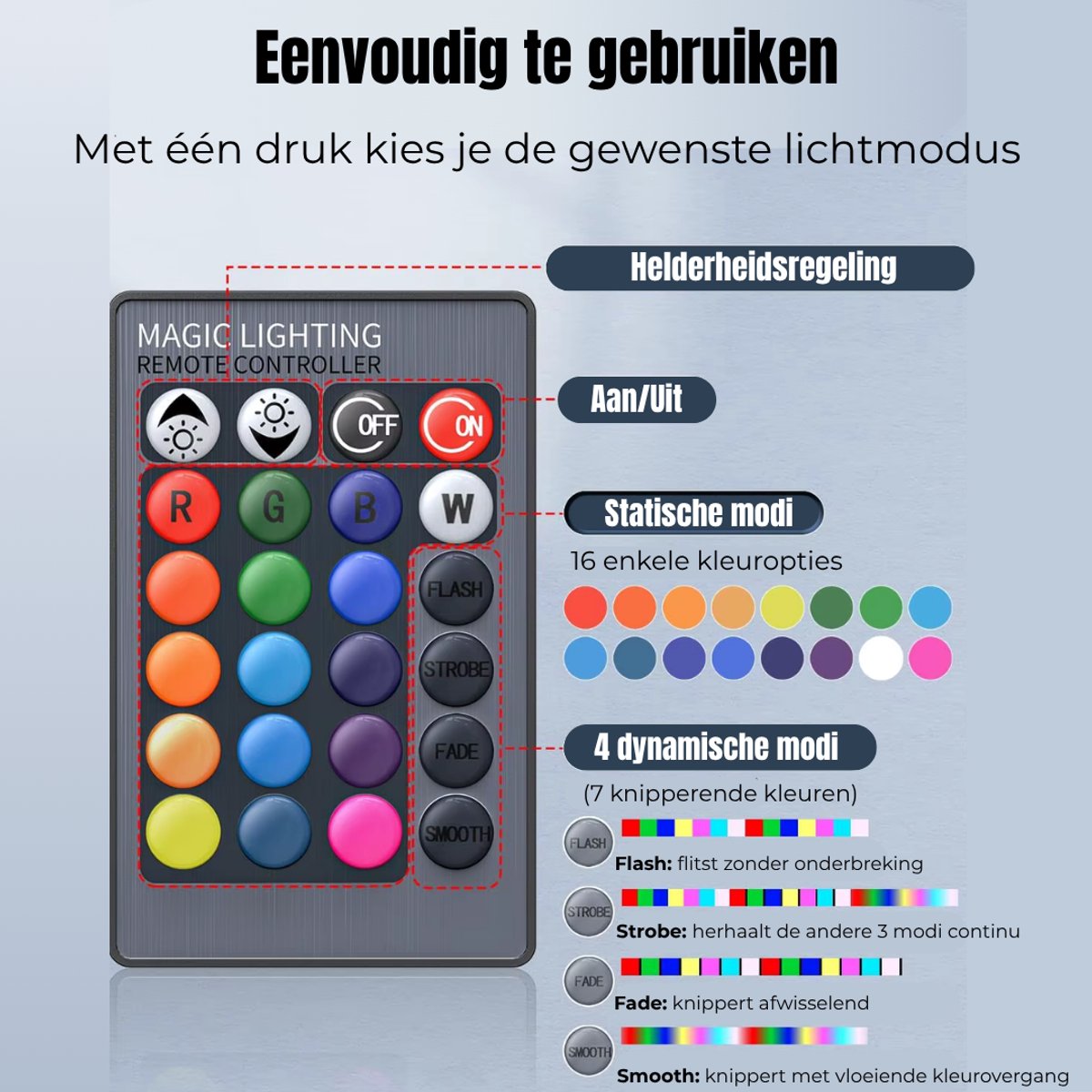 - Stel kleur en intensiteit direct in met draadloze afstandsbediening.