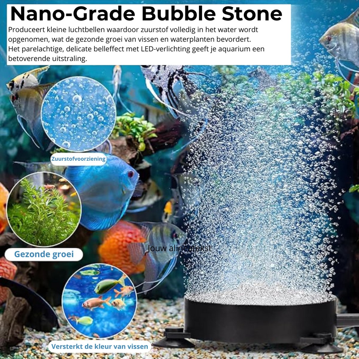 - Middelgrote/grote aquaria: combineer meerdere stenen of kies een krachtigere pomp voor een gelijkmatige verdeling van belletjes en licht.