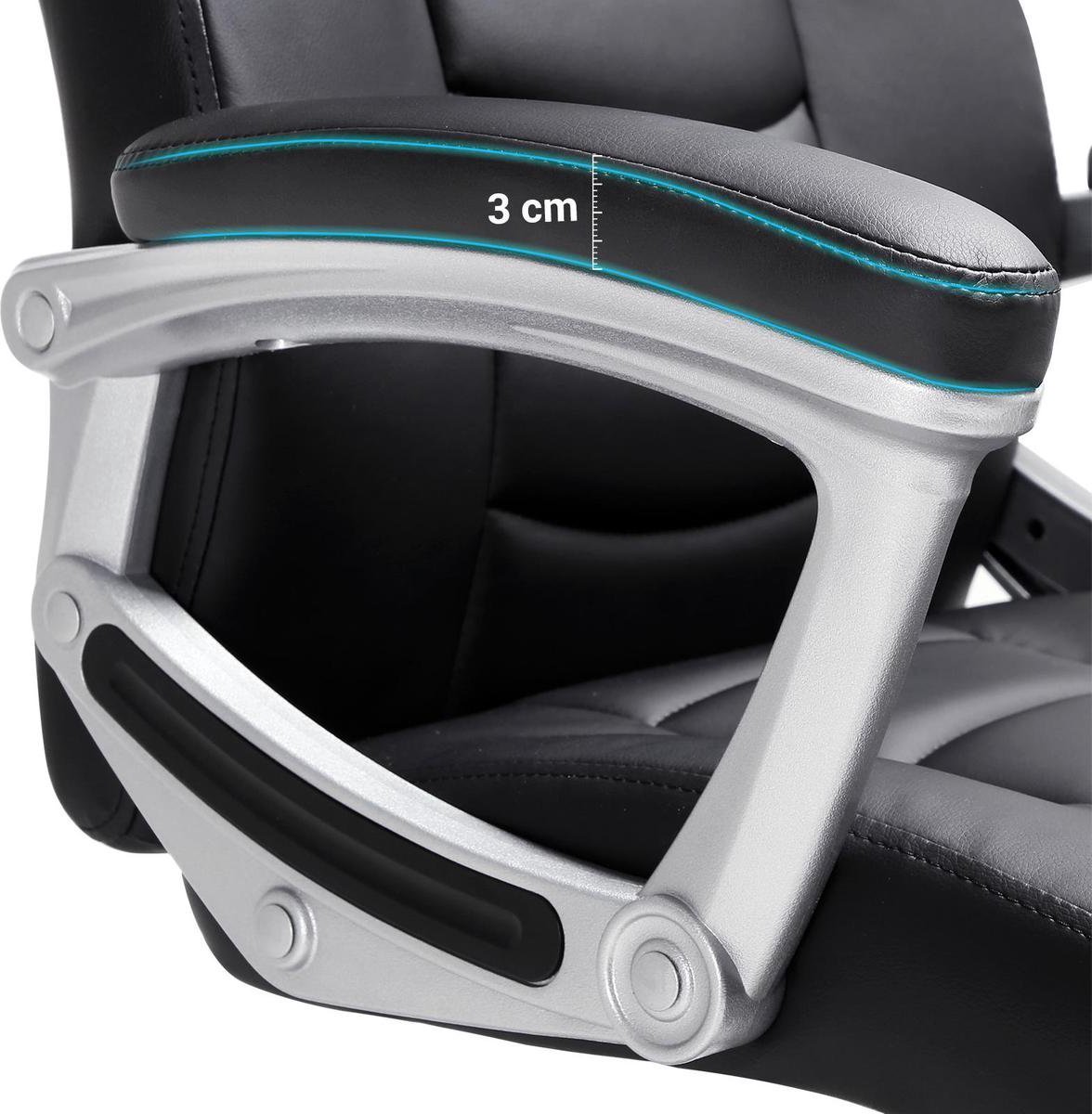 De bekleding is kunstleer gecombineerd met PU kunststof; dat maakt de stoel relatief makkelijk schoon te houden maar minder ademend dan stoffen bekleding. De vulling bestaat uit dichte spons wat comfortabele demping geeft voor langdurig zitten, zonder luxe memoryfoam-gevoel. De combinatie van materialen houdt onderhoud eenvoudig: vlekken veeg je snel weg met een vochtige doek.