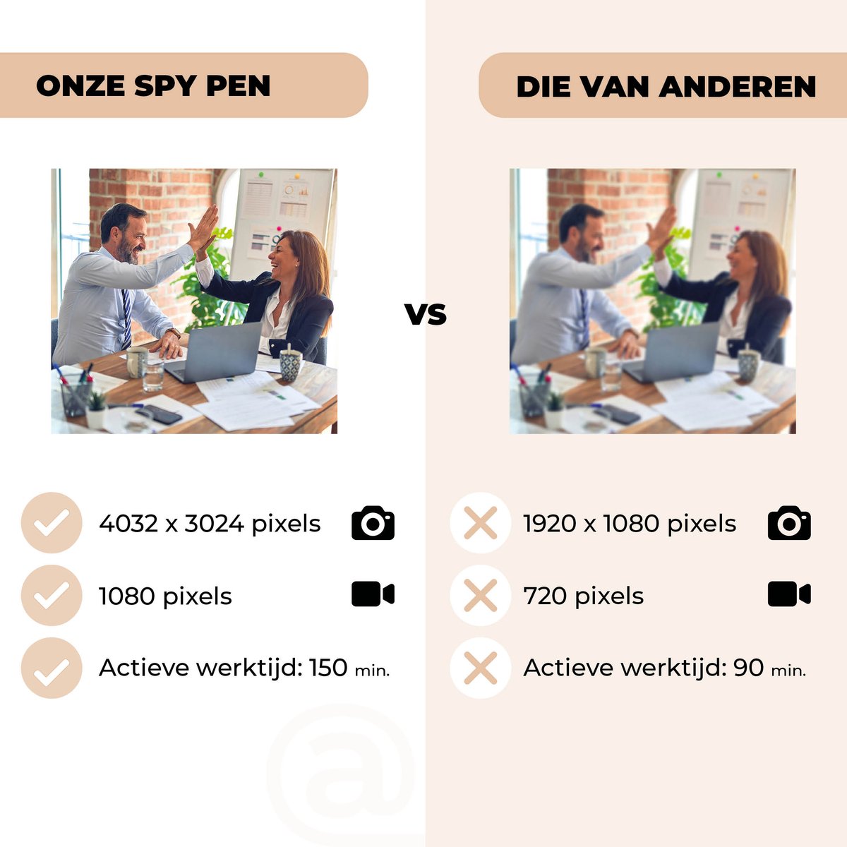 De Spy-pen doet precies wat hij moet: duidelijke datum- en tijdstempel bij de opnames en eenvoudig in te stellen. Beeld- en geluidskwaliteit zijn geen 4K, maar voor dat prijspunt meer dan voldoende. Al met al een prima aankoop.
