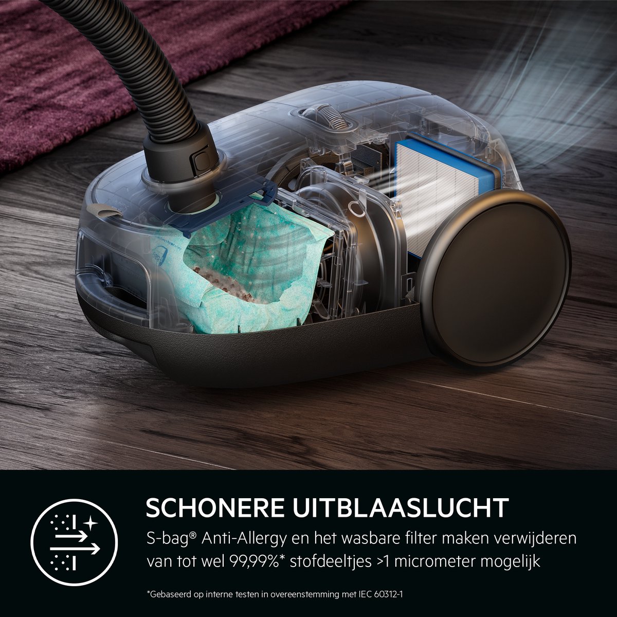 De AB61H6SW maakt gebruik van een hoogwaardig filter. Volgens de fabrikant is dit systeem ontworpen om tot 99,99% van de deeltjes te verwijderen voor een schonere, gezondere lucht. Voor huishoudens met allergieën is dat een cruciale eigenschap: de uitstootlucht wordt schoner, wat de kans op niezen of geïrriteerde luchtwegen verkleint. De combinatie met de zak zorgt ervoor dat stof en allergenen veilig in de zak blijven bij het vervangen.