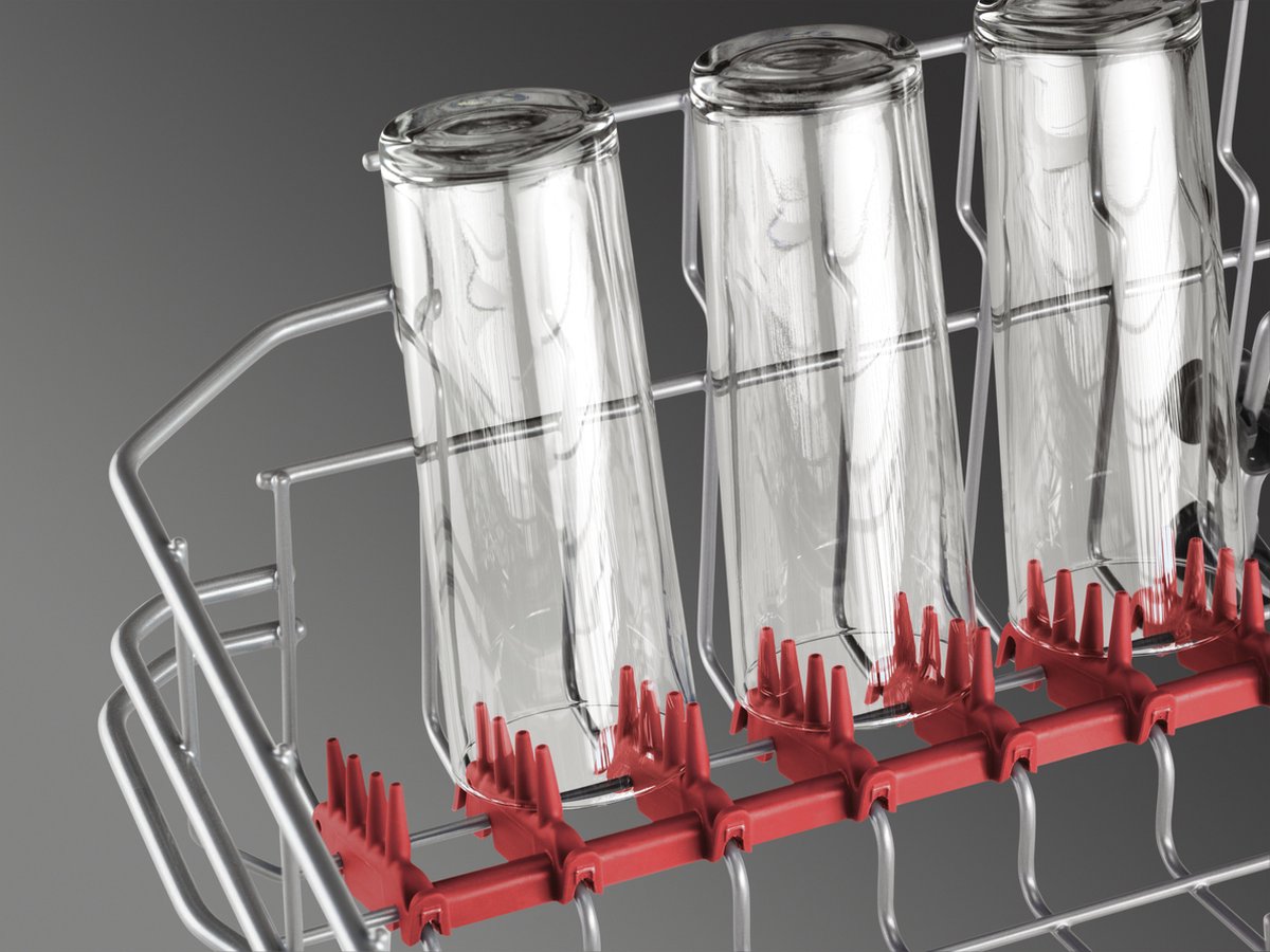 Wat het doet: de bovenste korf is uitgerust met SoftGrips en SoftSpikes die glazen stevig vasthouden tijdens het programma.
