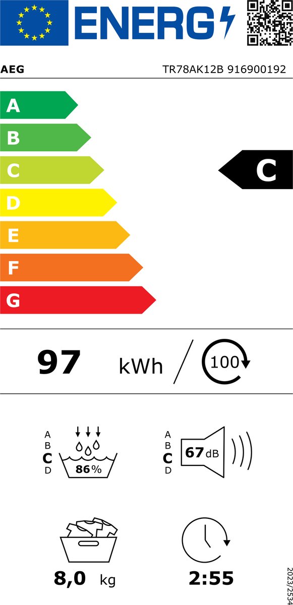Specificaties: AEG TR78AK12B 7000 SensiDry® test: energiezuinig drogen