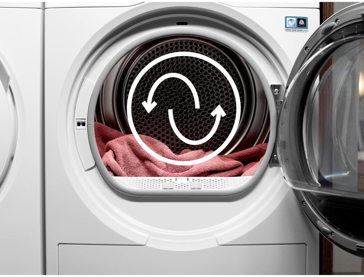 De trommel draait in twee richtingen. Dat klinkt simpel, maar heeft een groot effect: kleding raakt minder in elkaar verstrengeld, stukken komen gelijkmatiger in de luchtstroom en kreukvorming blijft beter binnen de perken. Het resultaat is droger textiel met minder plooien en een oppervlak dat zichtbaar en voelbaar verzorgd blijft.