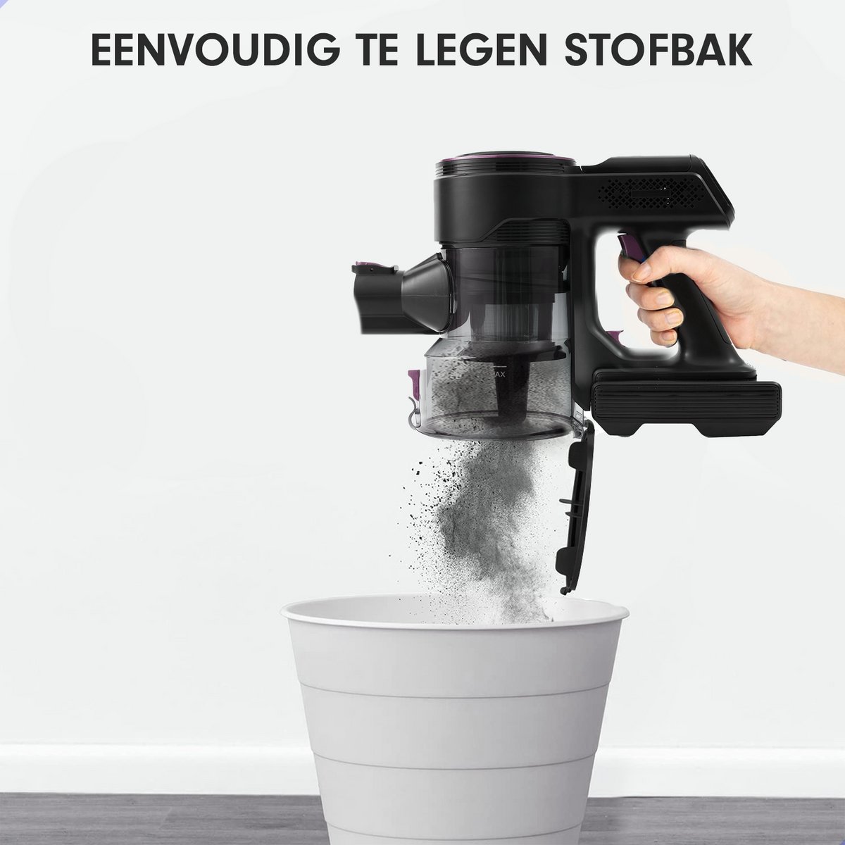 Onderhoud blijft eenvoudig: klik los, leeg hygiënisch boven de afvalbak en maak indien nodig het filter en de cyclonische behuizing schoon. Dat voorkomt geurtjes en houdt de zuigprestatie op peil.