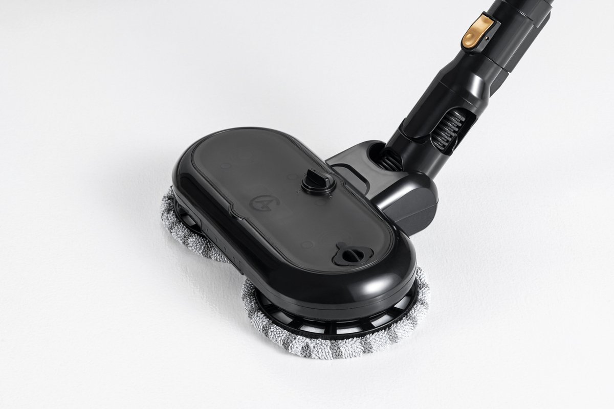 - Dweilen? Vul het 150 ml‑reservoir met water, plaats een schoon microvezeldoekje en activeer de watertoevoer met een kwartslag aan de knop.