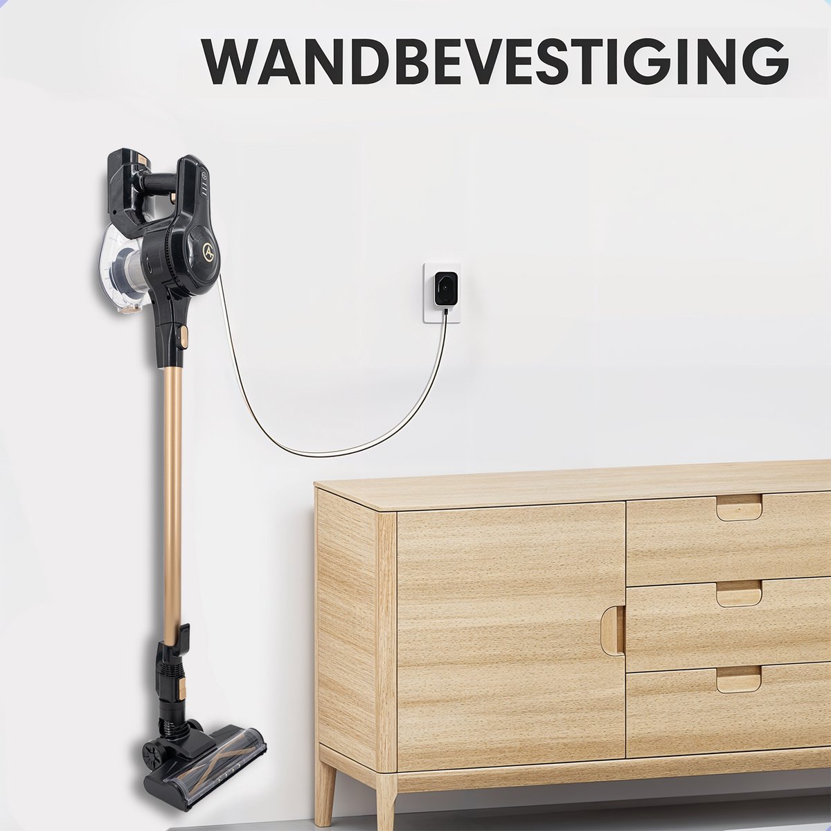 - De meegeleverde wandhouder houdt de steelstofzuiger uit de weg en klaar voor gebruik.