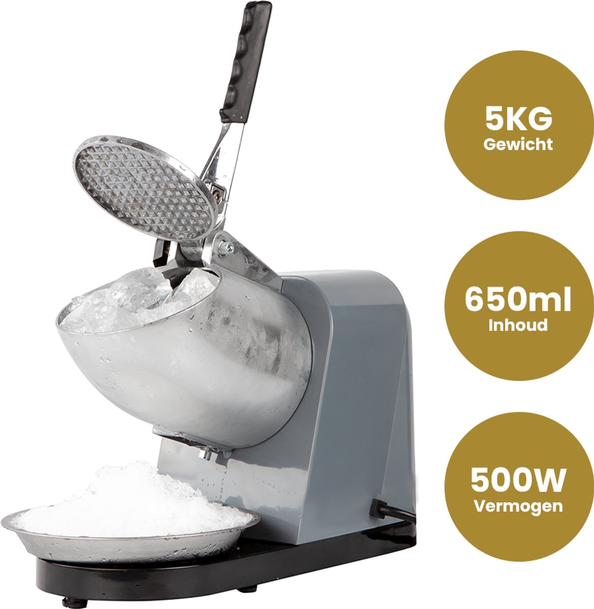 De GetIce elektrische ijscrusher is een compacte, krachtige machine om in korte tijd fijn gecrushed ijs te maken voor drankjes en desserts. Vul de ijsbak, sluit het deksel en druk op de knop: daarna heb je een portie egaal verkruimeld ijs dat perfect is voor cocktails, frisdrank met ijs of een slushachtige traktatie op warme dagen. Met zijn 500W motor (volgens de productinformatie) en een opvangbak van 650 ml combineert deze ijscrusher gebruiksgemak met voldoende capaciteit voor thuis en licht professioneel gebruik.