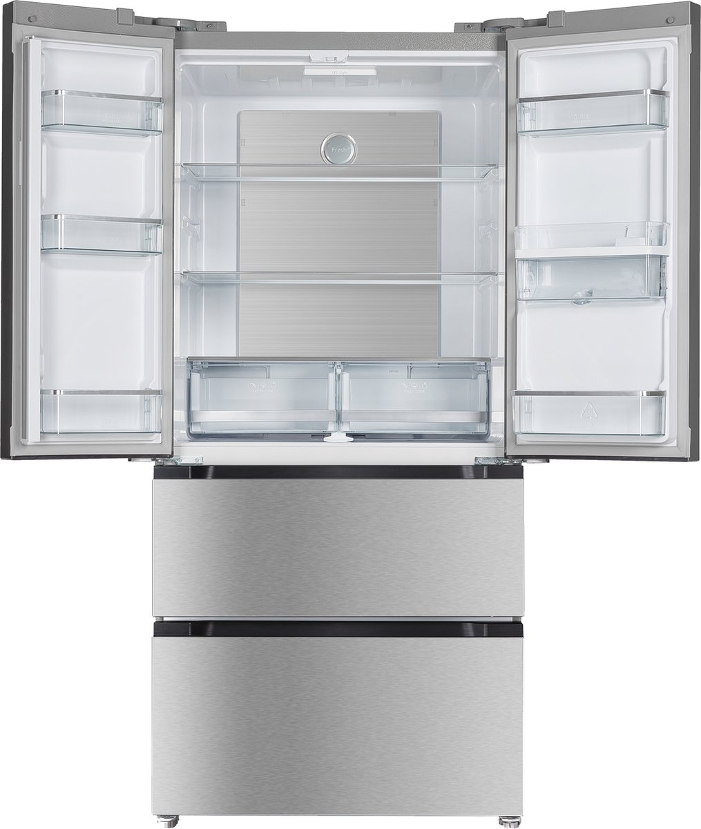 De afwerking in roestvrij staal (RVS) geeft de koelkast een strakke, tijdloze uitstraling die goed past in moderne keukens. Het greeploze design met geïntegreerd elektronisch bedieningspaneel oogt minimalistisch, terwijl het aanraakscherm op de handgreep de bediening dichtbij en intuïtief houdt. De dubbele deur van de koelkast (boven) en de twee laden voor de vriezer (onder) verdelen de grote inhoud logisch en ergonomisch: dagelijkse items op ooghoogte, vrieswaren in overzichtelijke lades.