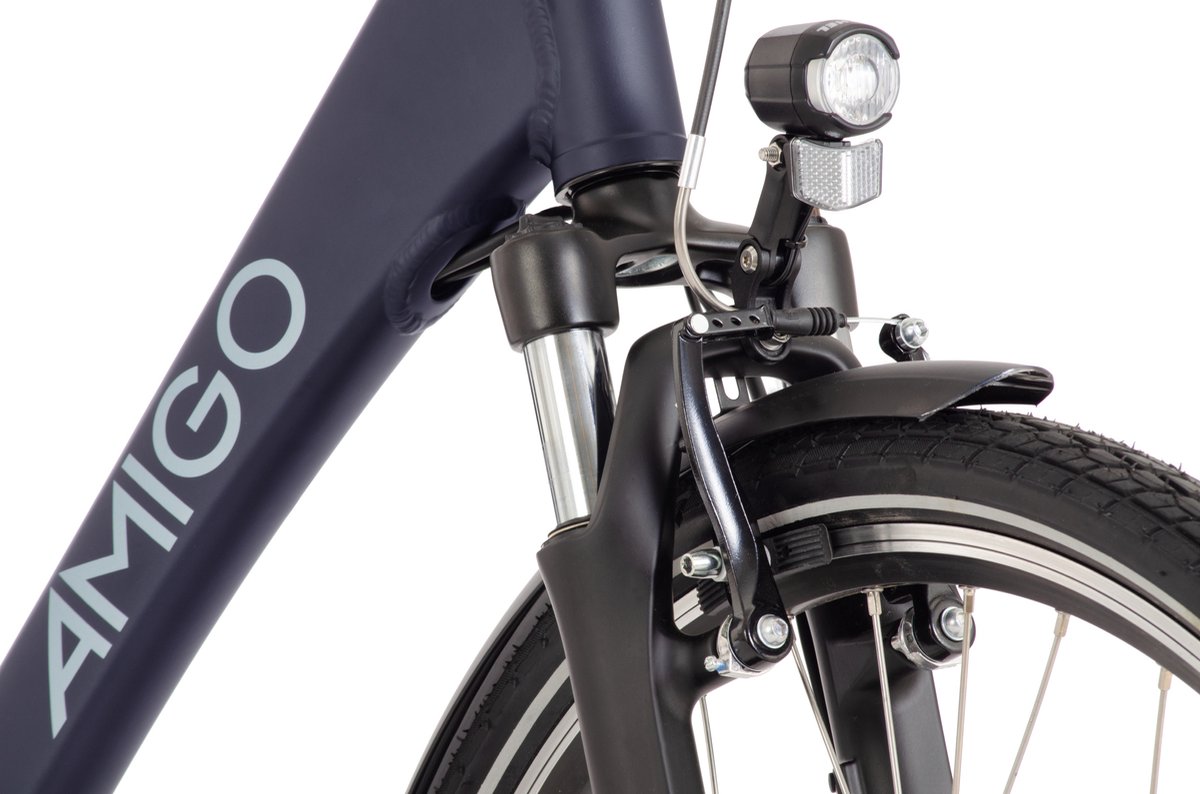 De AMIGO E-Alvor D2 elektrische fiets is gemaakt voor Nederlandse stadsritten en dagelijks woon-werkverkeer. De achterwielmotor geeft natuurlijke, stabiele ondersteuning; de 536,5 Wh accu zorgt voor ruime actieradius. De lage instap en verende elementen maken op- en afstappen extra comfortabel.