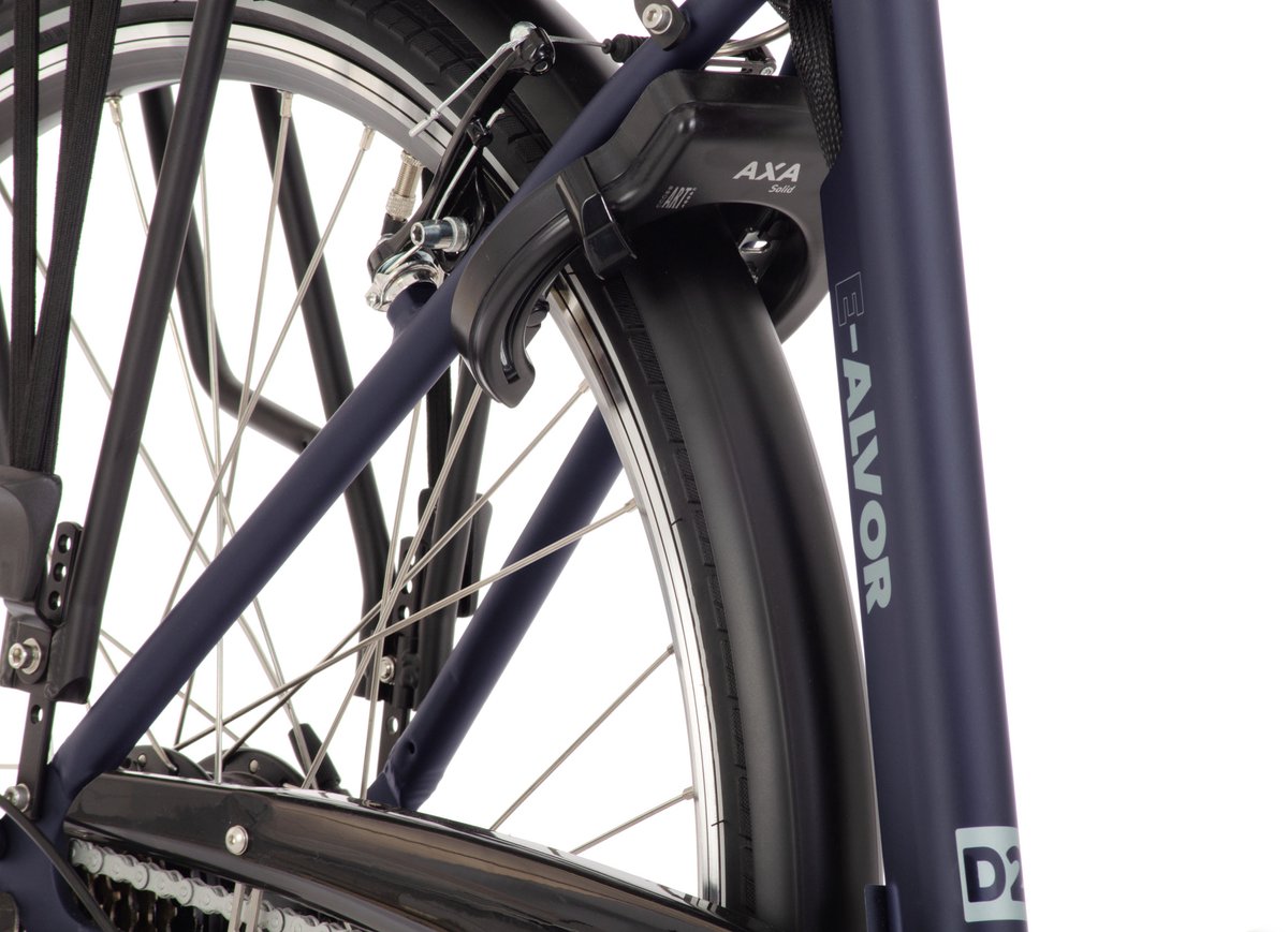 De AMIGO E-Alvor D2 zet in op duurzame, onderhoudsvriendelijke materialen, zonder overbodige franje. Het frame is van aluminium: lichter dan staal en beter bestand tegen roest. Ook de dubbelwandige aluminium velgen dragen bij aan stevigheid, wat je merkt wanneer je met volle tas of kinderzitje over slecht wegdek rijdt. De gekozen kleur is matblauw, gecombineerd met zwarte componenten voor een strakke, tijdloze uitstraling die niet snel verveelt.
