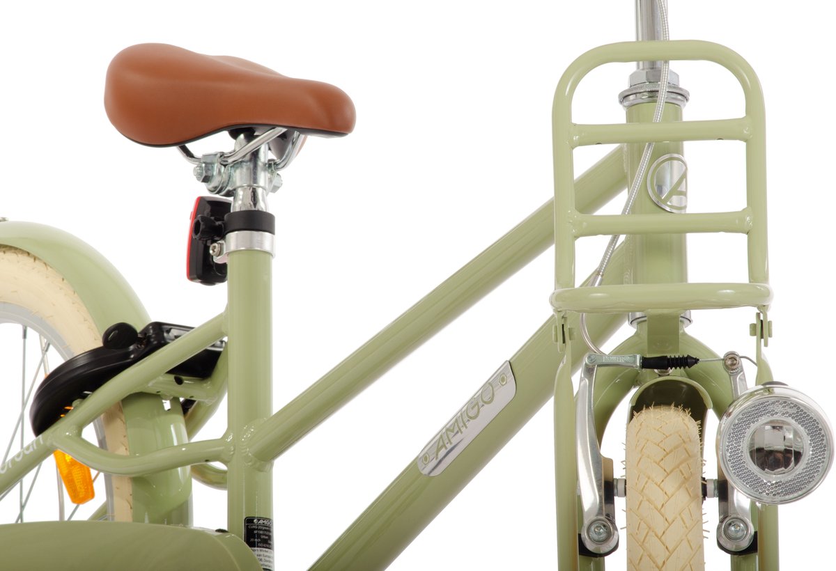Het frame is volledig van aluminium. Dat is lichter dan staal, waardoor sturen en optrekken makkelijker gaan. Aluminium is bovendien van nature beter bestand tegen roest. AMIGO voegt daar drie laklagen aan toe op zowel het frame als de stalen spatborden. Die meervoudige laklaag is bedoeld om de nieuwwaarde te behouden bij vallen en opstaan, een realiteit bij kinderfietsen. Het resultaat: minder roestvorming en minder zichtbare gebruikssporen, zodat de fiets er langer verzorgd uitziet.