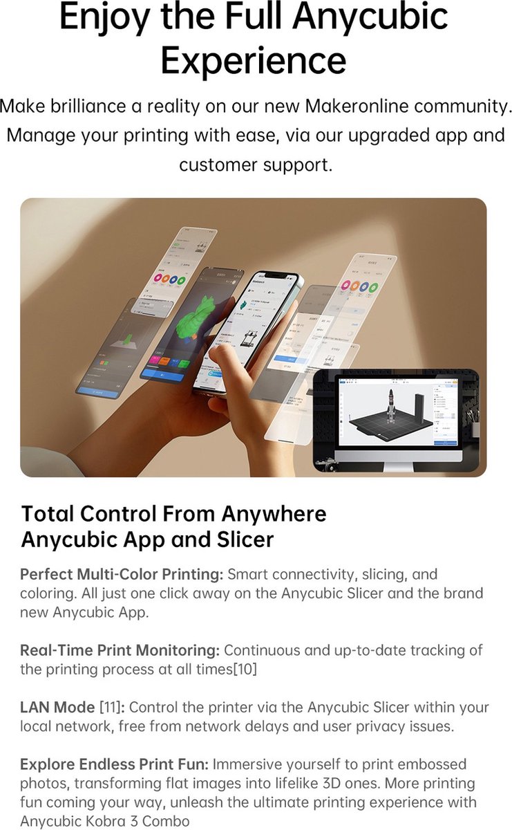 De AnyCubic Kobra 3 Combo is een snelle en veelzijdige 3D-printer met meerkleurige mogelijkheden, bedoeld voor makers die zonder gedoe hoogwaardige resultaten willen bereiken. Dankzij een royale bouwruimte, slimme stabilisatie en beheer op afstand is dit een aantrekkelijke keuze voor zowel instappers als gevorderden die meer willen dan enkel basale prototyping.