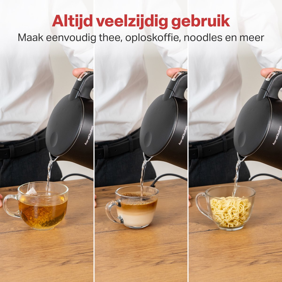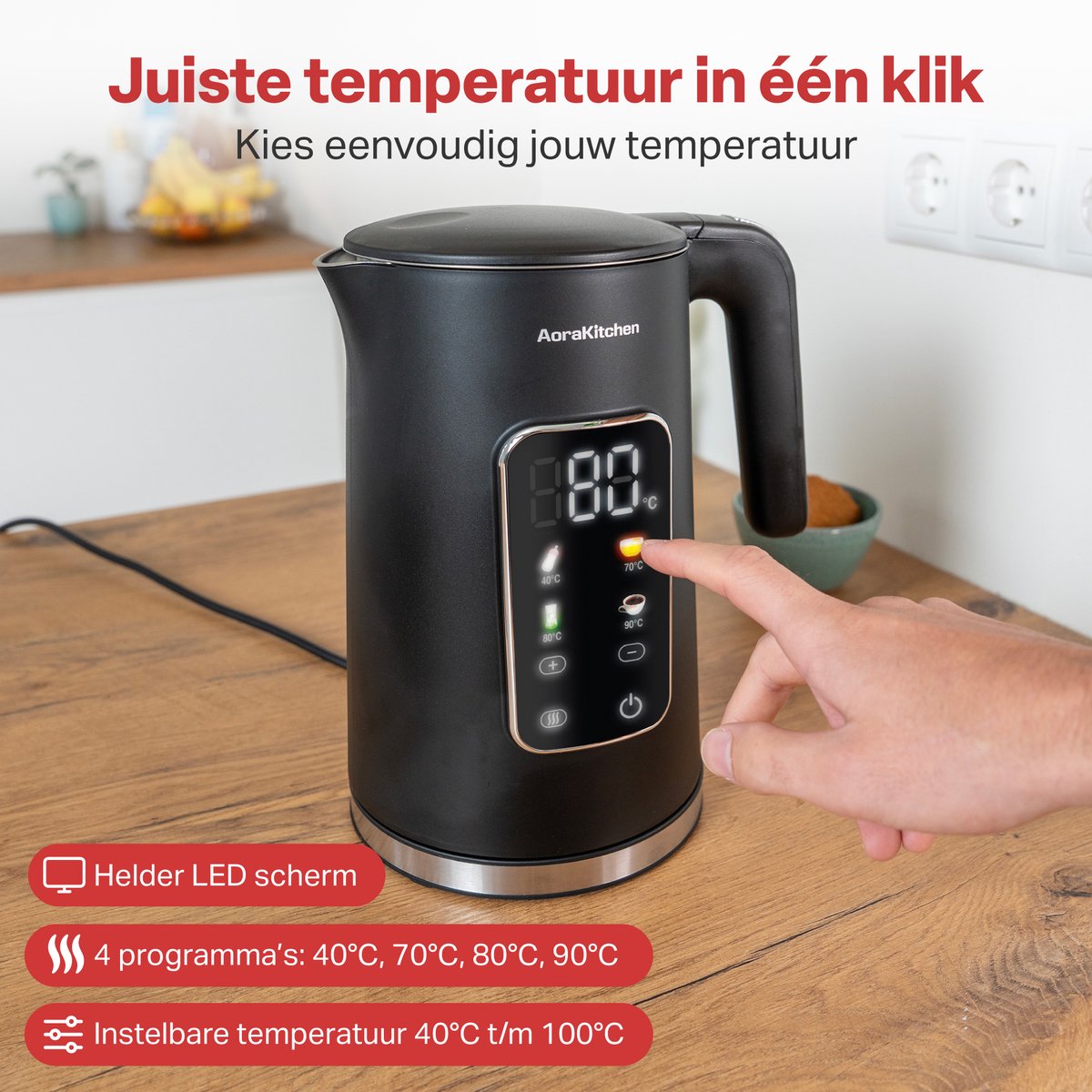 De AoraKitchen waterkoker is een elegante waterkoker zwart met een LED‑scherm en nauwkeurige temperatuurregeling tussen 40 en 100 °C. Dankzij vier voorinstellingen (40/70/80/90 °C) en een warmhoudfunctie bepaal je precies hoe heet je water wordt – ideaal voor groene thee, filterkoffie, instant noedels of babyflesjes. De dubbelwandige cool‑touch behuizing blijft aan de buitenkant koel, terwijl de RVS‑binnenzijde de smaak zuiver houdt.