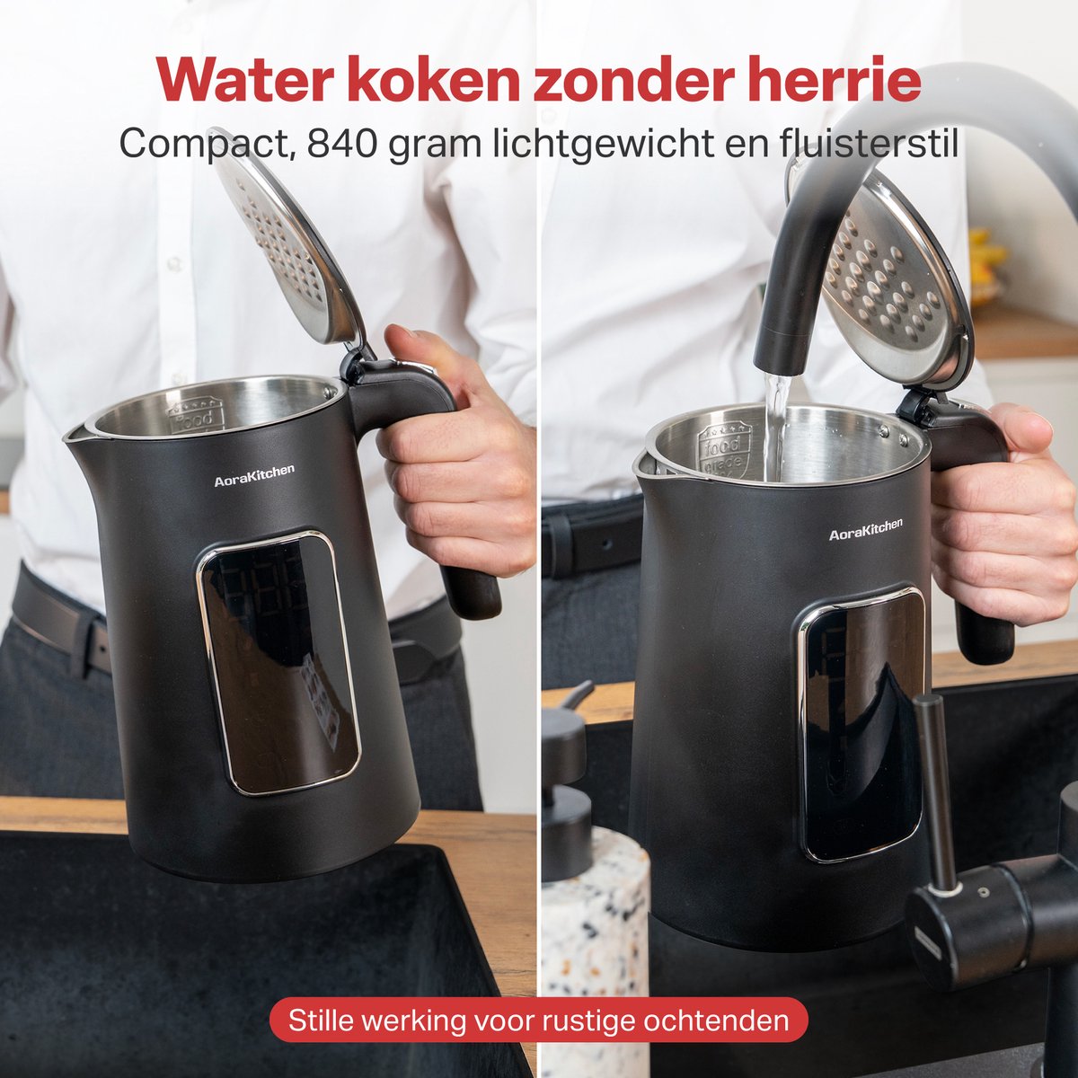 De AoraKitchen is een waterkoker met temperatuurregeling voor Nederlandse huishoudens die snelheid en precisie willen. Dankzij het led-scherm, vier voorinstellingen en handmatige 40–100°C controle zet je thee en koffie exact goed. De RVS binnenzijde en het lichte gewicht van 840 gram maken dagelijks gebruik comfortabel.