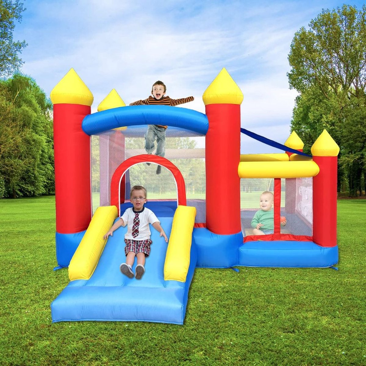 Het Springkasteel Blauw, Rood, en Geel is een multifunctioneel opblaasbaar speelveld dat verschillende speelvormen combineert: trampoline, ballenbad, basketbalkorf, voetbaldoel en glijbaan in één unit. Dit product richt zich op gezinnen met jonge kinderen, kinderfeestjes en opvangsituaties waar afwisselend en actief spel gewenst is.
