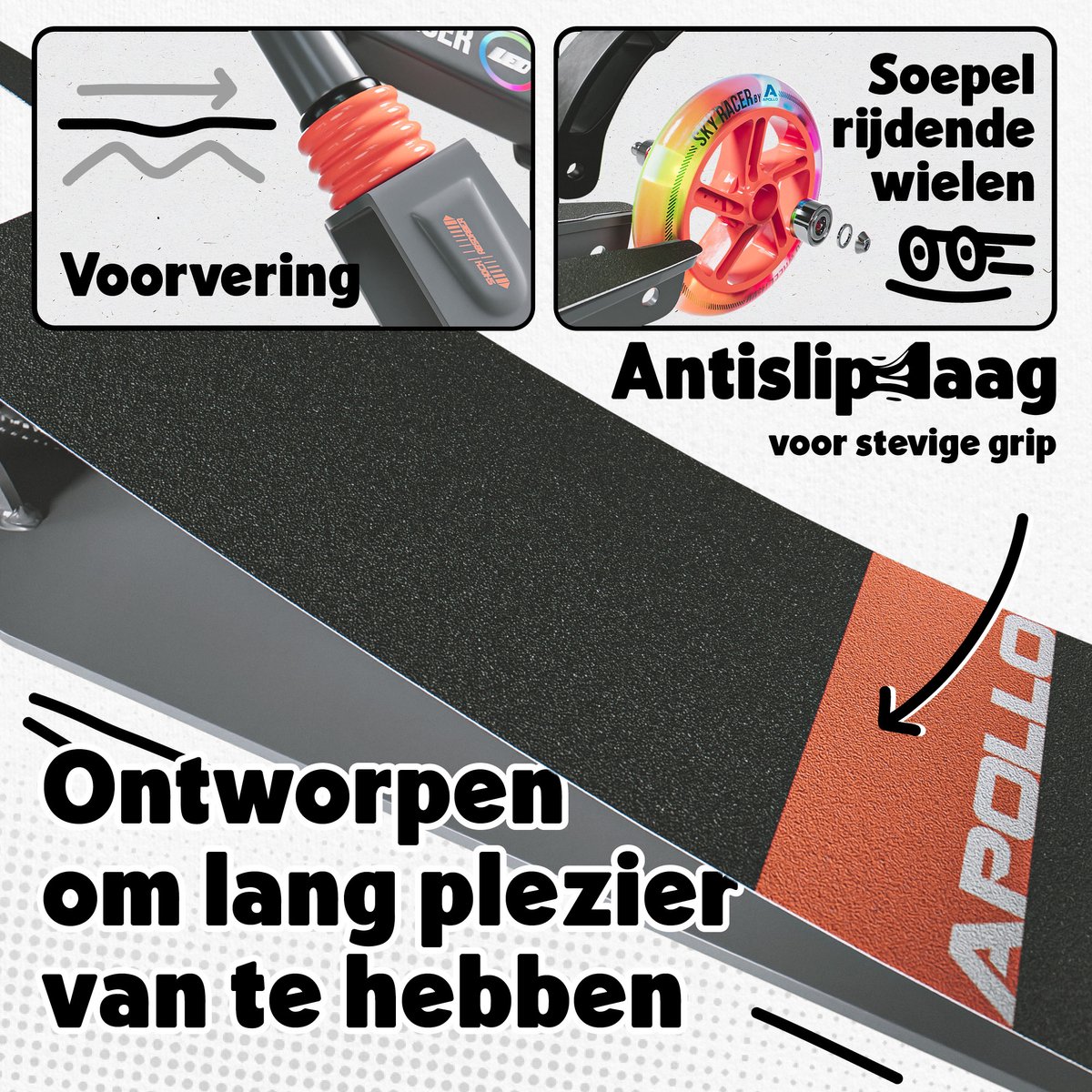 De Apollo Cityscooter Skyracer is een lichtgewicht, opvouwbare step met opvallende lichtgevende wielen en een mountainbike-achtige vering voor comfortabel stadsgebruik. Hij richt zich op zowel kinderen vanaf ongeveer 5 jaar als tieners en volwassenen tot maximaal 100 kg. De step combineert een compact inklapsysteem met relatief grote 145 mm wielen voor een vlotte rit over leerbare stoepen en kasseien.
