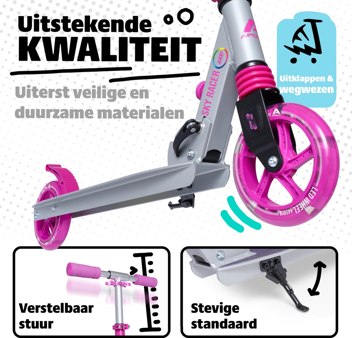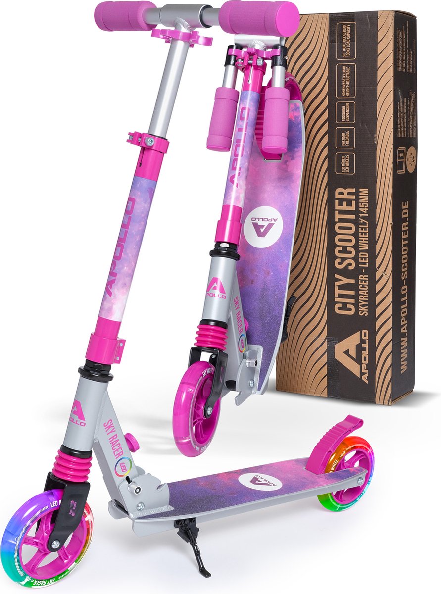 De Apollo Cityscooter Skyracer is een lichtgewicht, opvouwbare step met vering en verlichte wielen. Het model combineert een relatief ruime deck (45 x 12 cm) met 145 mm High Rebound PU-wielen en een shock absorber boven het voorwiel, bedoeld om kleine oneffenheden in de stad glad te strijken. De step richt zich op kinderen vanaf ongeveer 5 jaar, tieners en volwassenen tot een maximaal gewicht van circa 100 kg. (bron: listing, gecontroleerd 2025)