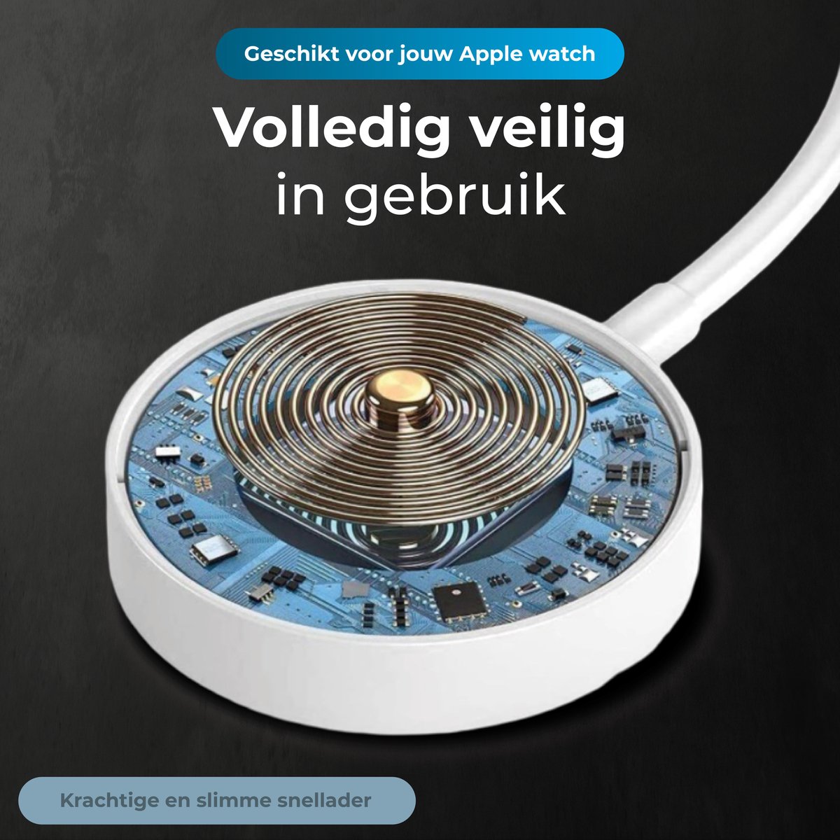 De magneet die in de laadkop verwerkt zit, zorgt voor een stevige verbinding tussen kabel en horloge. Dit voorkomt wegschuiven gedurende het laden, bijvoorbeeld wanneer je de watch op een nachtkastje legt of in een tas vervoert terwijl hij nog is aangesloten (bron: listing, checked 2025).