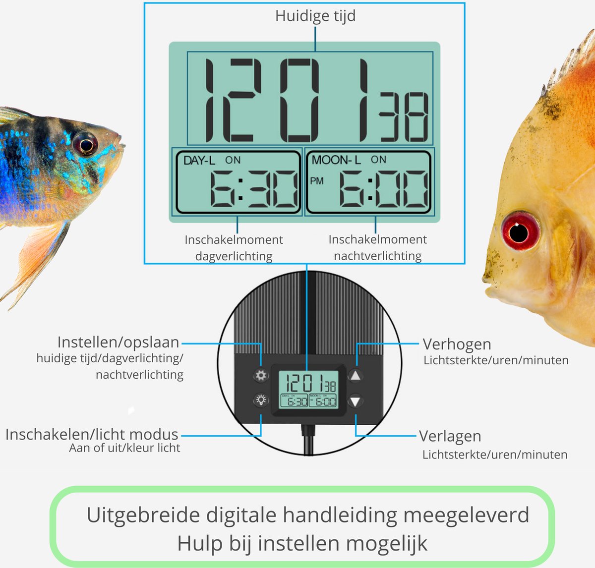 De timer stel je in via de knoppen op de lamp. Je bepaalt zelf wanneer de dagstand start en eindigt en wanneer de lamp overschakelt op nachtlicht. Handig: je hebt geen losse tijdschakelaar nodig. De dag/nacht-cyclus zorgt voor een vaste routine voor vissen, garnalen en planten. Dat helpt bij het stabiliseren van gedrag en groei, en het maakt je eigen dagelijkse ritme voorspelbaarder: schoonmaken of voeren kan mooi rond de lichtperioden worden gepland.