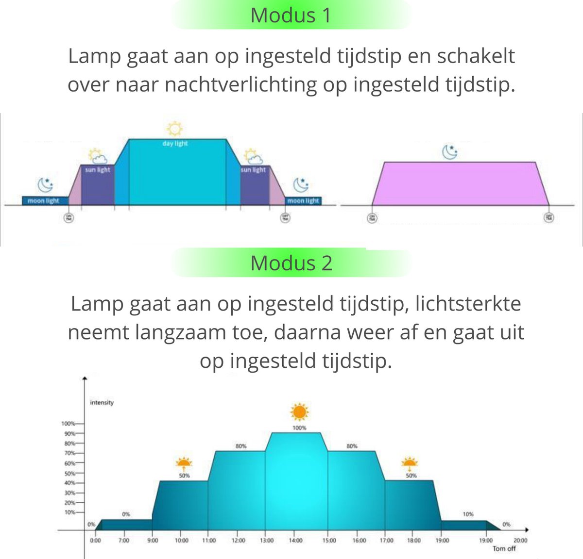 - Zonsopkomst/zonsondergang: Stel ’s ochtends een zachte opstart in. Dat helpt om schrikbewegingen te voorkomen. In de avond dim je geleidelijk of laat je de lamp overschakelen op het nachtlicht.