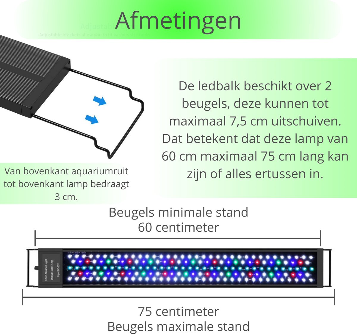 De uitschuifbare beugels zijn ontworpen voor bakken met een lengte van 60 tot 75 centimeter. Volgens de aanbieder kunnen de twee beugels elk tot ongeveer 7,5 centimeter uitschuiven, waardoor je de lamp netjes kunt centreren op aquaria in deze maatreeks. De bediening gebeurt via knoppen op het uiteinde/bovenop de ledbalk, zodat je zonder losse controllers de helderheid, timer en kleurinstellingen kunt regelen.