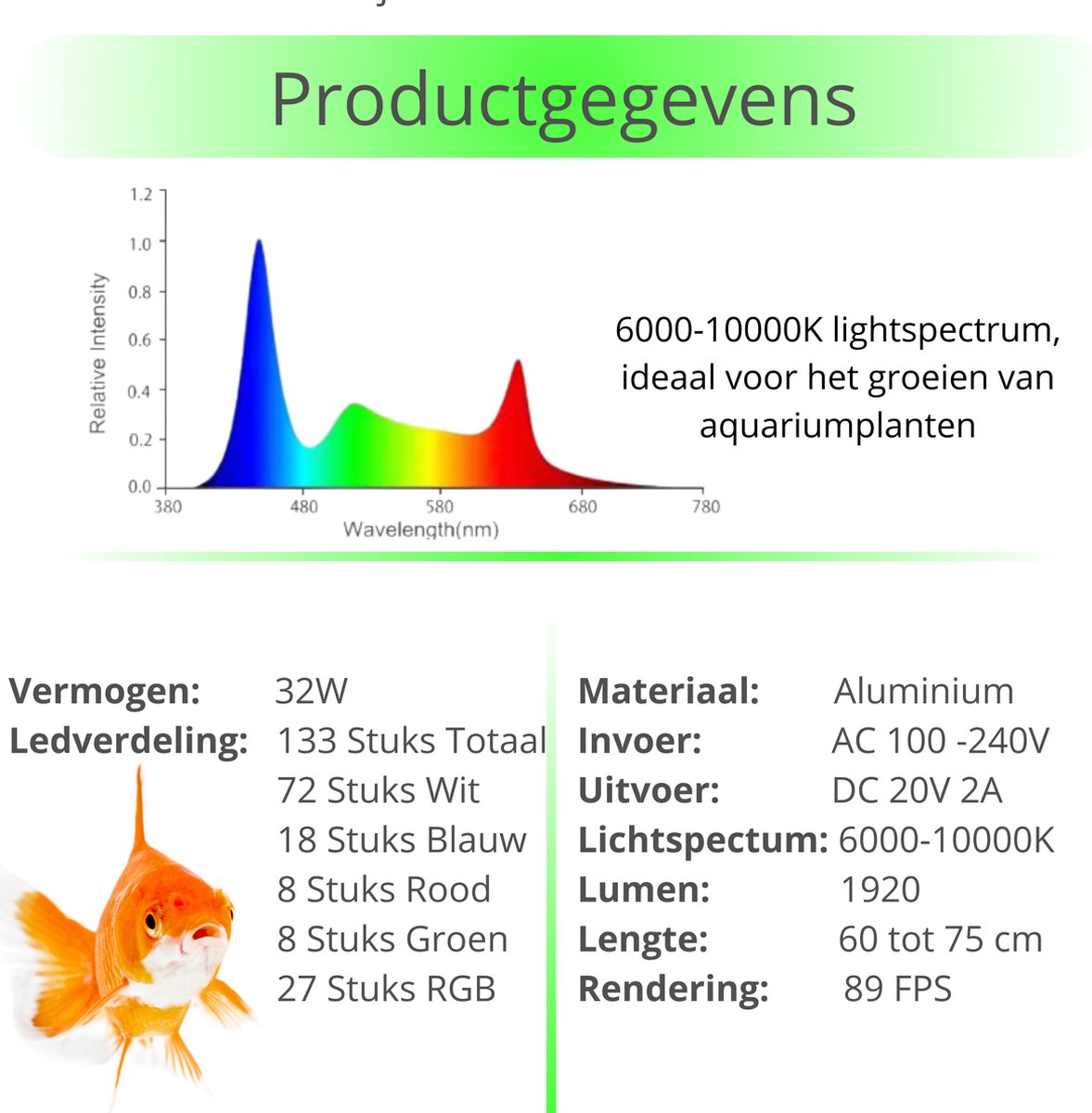 | Ingebouwde timer met dag/nacht-cyclus en zonsopkomst/zonsondergang | Geen specifieke gegevens over kleurweergave-index of PAR-waarden |