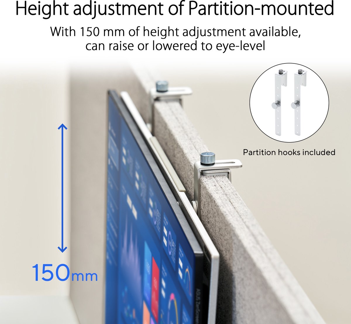 - Wat het is: een meegeleverde haakset om de monitor aan scheidingswanden of partition-wanden te hangen, met 150 mm hoogteverstelling (volgens de fabrikant).