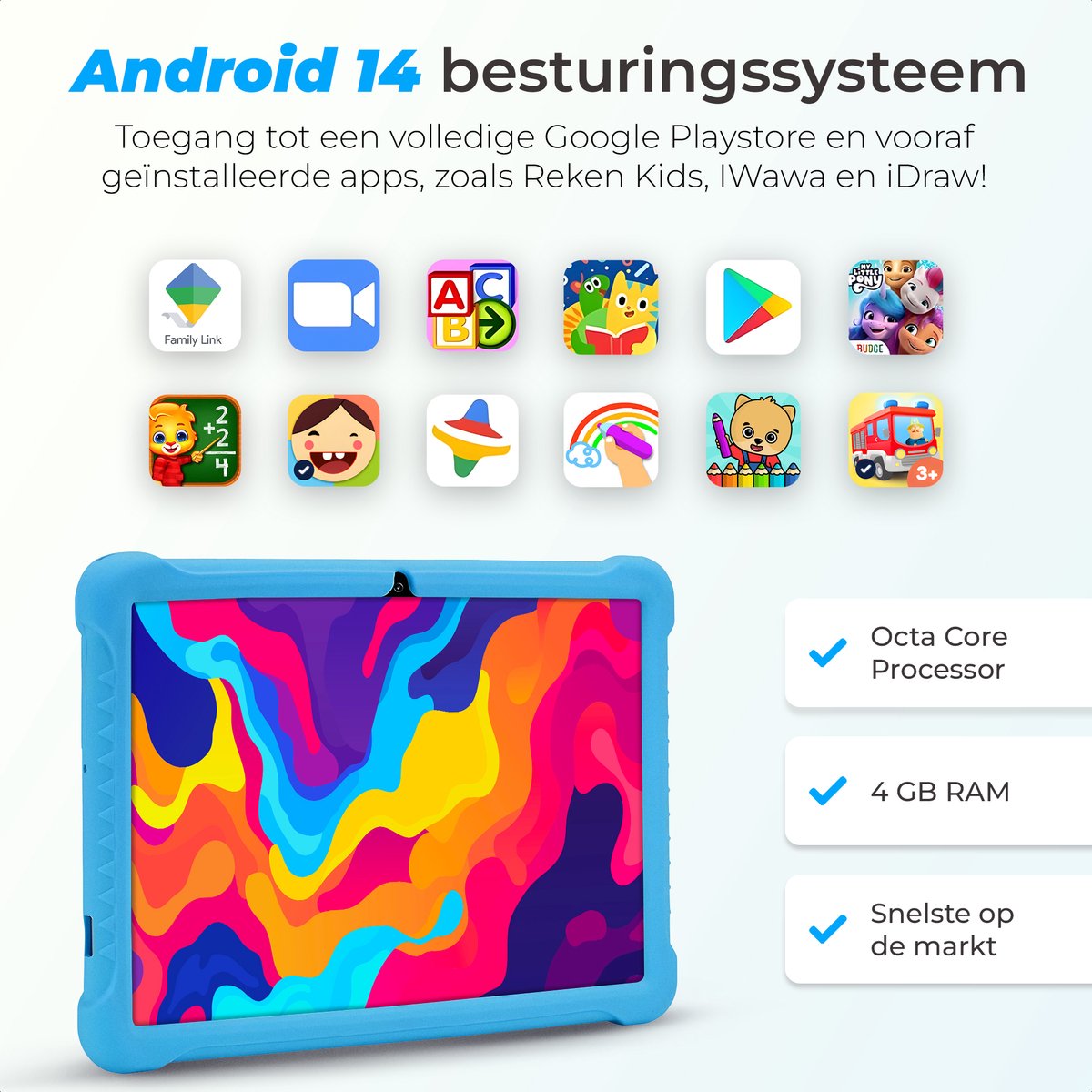 Wat het doet: 4 GB RAM biedt vlotte multitasking voor kindvriendelijke toepassingen; 64 GB interne opslag geeft ruimte voor apps en media, en kan via microSD worden uitgebreid tot 512 GB.