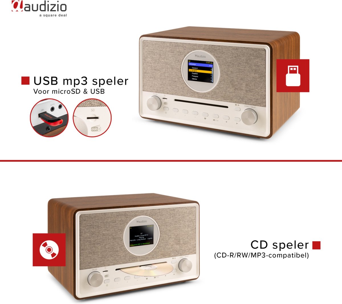 - Bewaar en speel mp3’s vanaf usb of microSD voor persoonlijke muziekcollecties.
