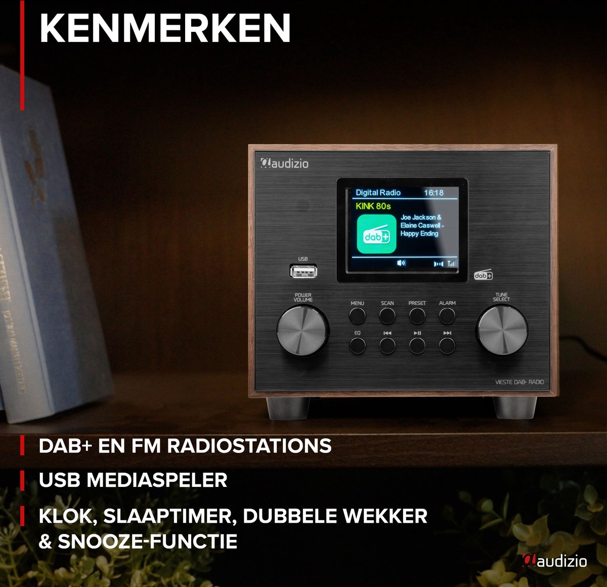 Overzicht:De Audizio Vieste is een veelzijdige en stijlvolle DAB radio, ideaal voor Nederlandse luisteraars die helder geluid en moderne functies willen. Met een compact houtlook‑ontwerp van 24,5 x 16,5 x 14,7 cm past hij moeiteloos in elk interieur.
